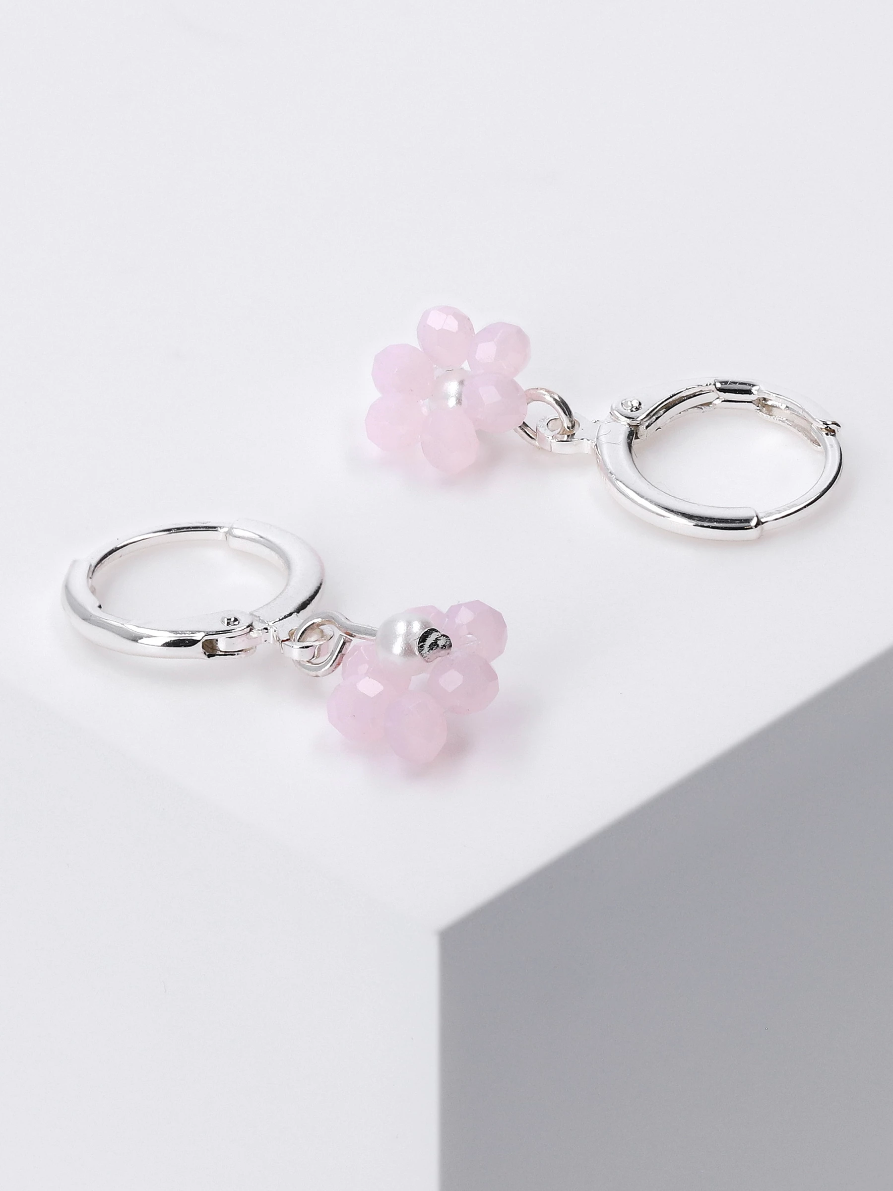 Femininer Ohrschmuck mit Zierperle und Glassteinen, die eine Blumen bilden. Die edle Huggie-Creole kann sowohl einzeln als auch kombiniert im Earcandy-Stil getragen werden. Durch die hochwertige Versilberung bekommt der Ohrschmuck den letzten Schliff verpasst.