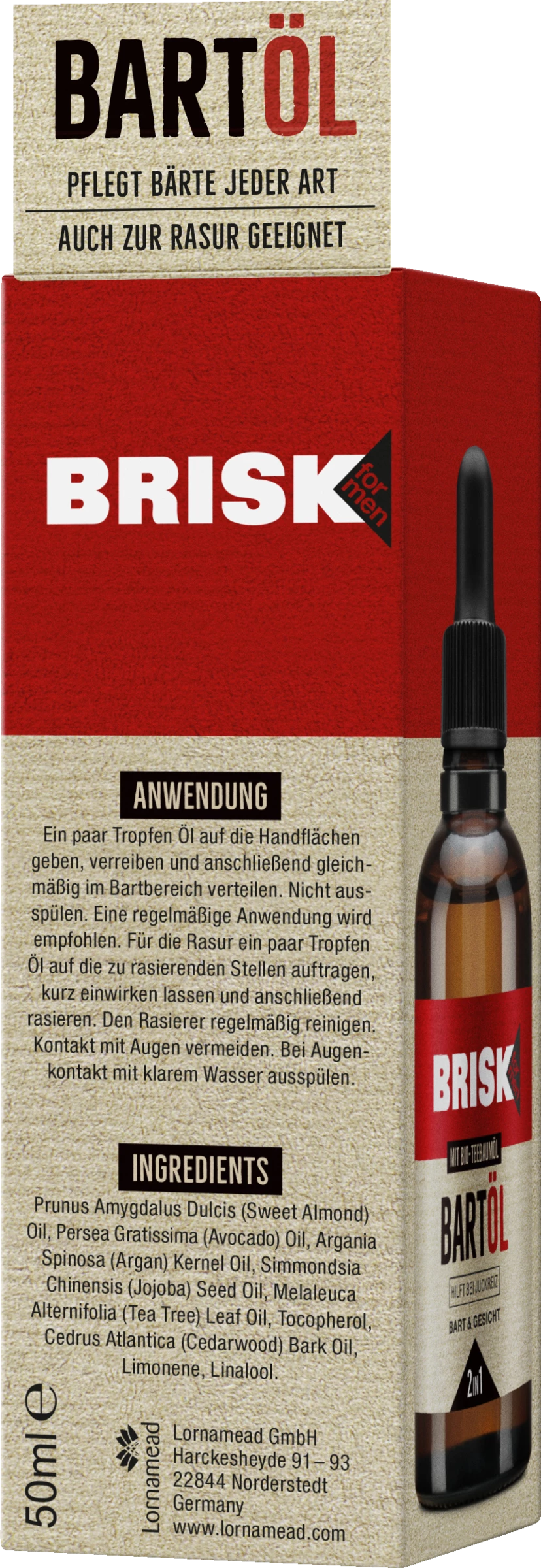 Das BRISK Bartöl wurde für die Pflege von Bärten und der darunterliegenden Gesichtshaut entwickelt. Dank der ultraleichten Formel zieht es schnell ein und hinterlässt keinen Fettfilm auf der Haut. Der Bart fühlt sich spürbar weicher an. Zudem ist das Bartöl für die Rasur einsetzbar, ideal für Konturen rund um den Bart.
