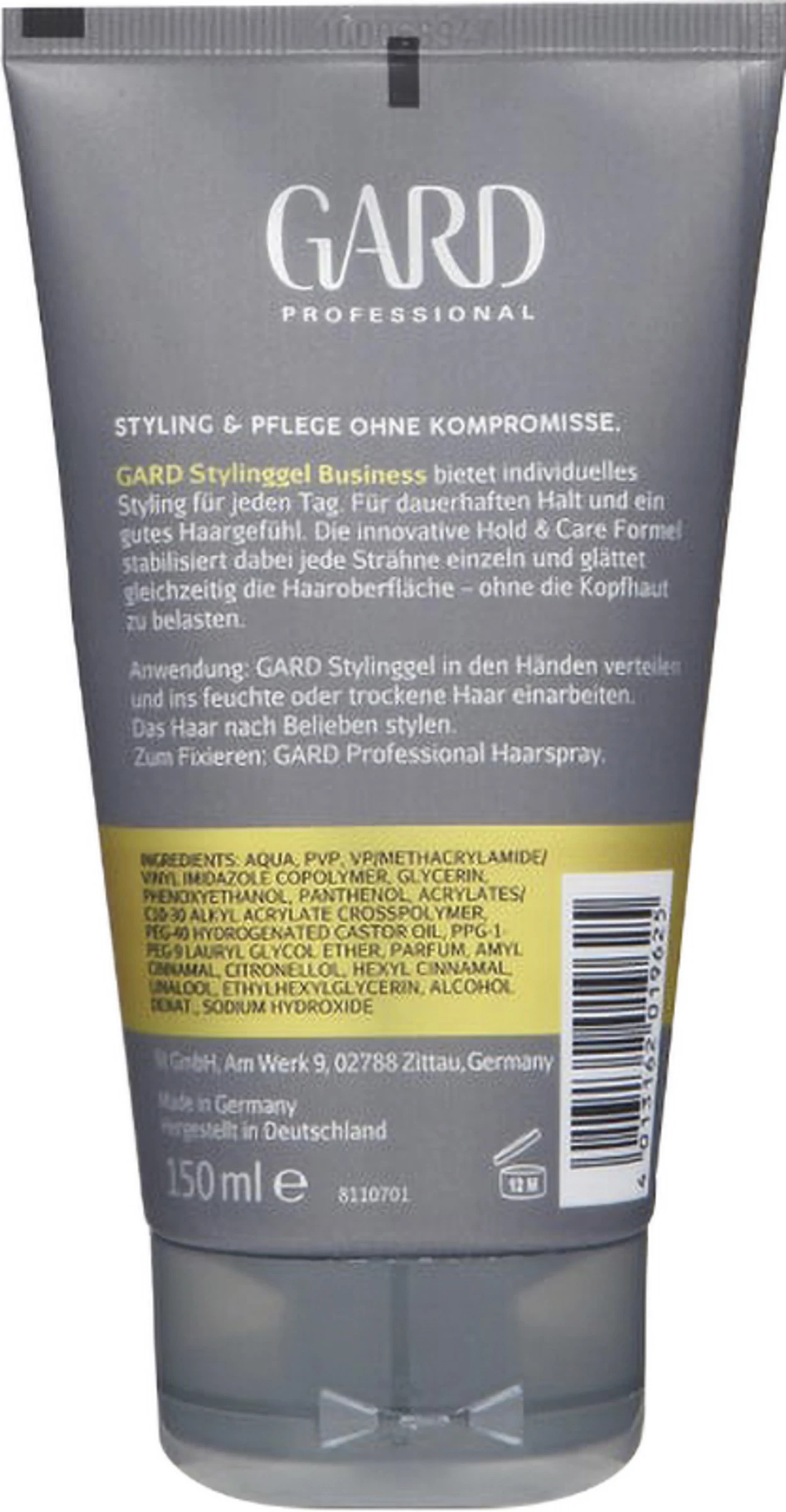 GARD Stylinggel Business bietet individuelles Styling für jeden Tag. Für dauerhaften Halt und ein gutes Haargefühl. Die innovative Hold und Care Formel stabilisiert dabei jede Strähne einzeln und glättet gleichzeitig die Haaroberfläche – ohne die Kopfhaut zu belasten.