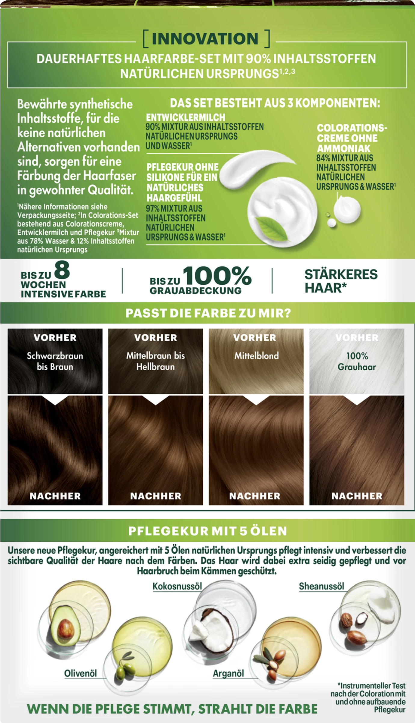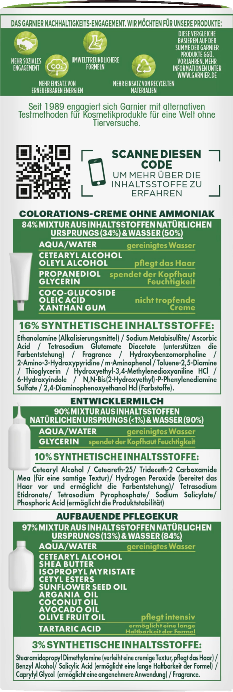 Colorationscreme: “AQUA /WATER • CETEARYL ALCOHOL • ETHANOLAMINE • GLYCERIN • PROPANEDIOL • OLEICACID • OLEYL ALCOHOL • COCO-GLUCOSIDE • m-AMINOPHENOL •2-AMINO-3-HYDROXYPYRIDINE • ASCORBIC ACID • SODIUM METABISULFITE •HYDROXYBENZOMORPHOLINE • HYDROXYETHYL-3,4-METHYLENEDIOXYANILINE HCL •6-HYDROXYINDOLE • THIOGLYCERIN • TOLUENE-2,5-DIAMINE • XANTHAN GUM •N,N-BIS(2-HYDROXYETHYL)-p-PHENYLENEDIAMINE SULFATE • TETRASODIUM GLUTAMATEDIACETATE • 2,4-DIAMINOPHENOXYETHANOL HCL • PARFUM / FRAGRANCE. “Entwicklermilch oder -creme: “AQUA / WATER • HYDROGEN PEROXIDE • CETEARYL ALCOHOL • SODIUM SALICYLATE •TRIDECETH-2 CARBOXAMIDE MEA • PHOSPHORIC ACID • CETEARETH-25 • TETRASODIUMETIDRONATE • TETRASODIUM PYROPHOSPHATE • GLYCERIN.”Pflegekur: “AQUA / WATER • CETEARYL ALCOHOL • STEARAMIDOPROPYL DIMETHYLAMINE • ISOPROPYLMYRISTATE • CETYL ESTERS • HELIANTHUS ANNUUS SEED OIL / SUNFLOWER SEED OIL •PARFUM / FRAGRANCE • OLEA EUROPAEA FRUIT OIL / OLIVE FRUIT OIL • ARGANIA SPINOSAKERNEL OIL • ROSMARINUS OFFICINALIS LEAF EXTRACT / ROSEMARY LEAF EXTRACT • COCOSNUCIFERA OIL / COCONUT OIL • PERSEA GRATISSIMA OIL / AVOCADO OIL • BUTYROSPERMUMPARKII BUTTER / SHEA BUTTER • CAPRYLYL GLYCOL • CITRIC ACID • TARTARIC ACID •TOCOPHEROL • SALICYLIC ACID • LINALOOL • BENZYL ALCOHOL. “