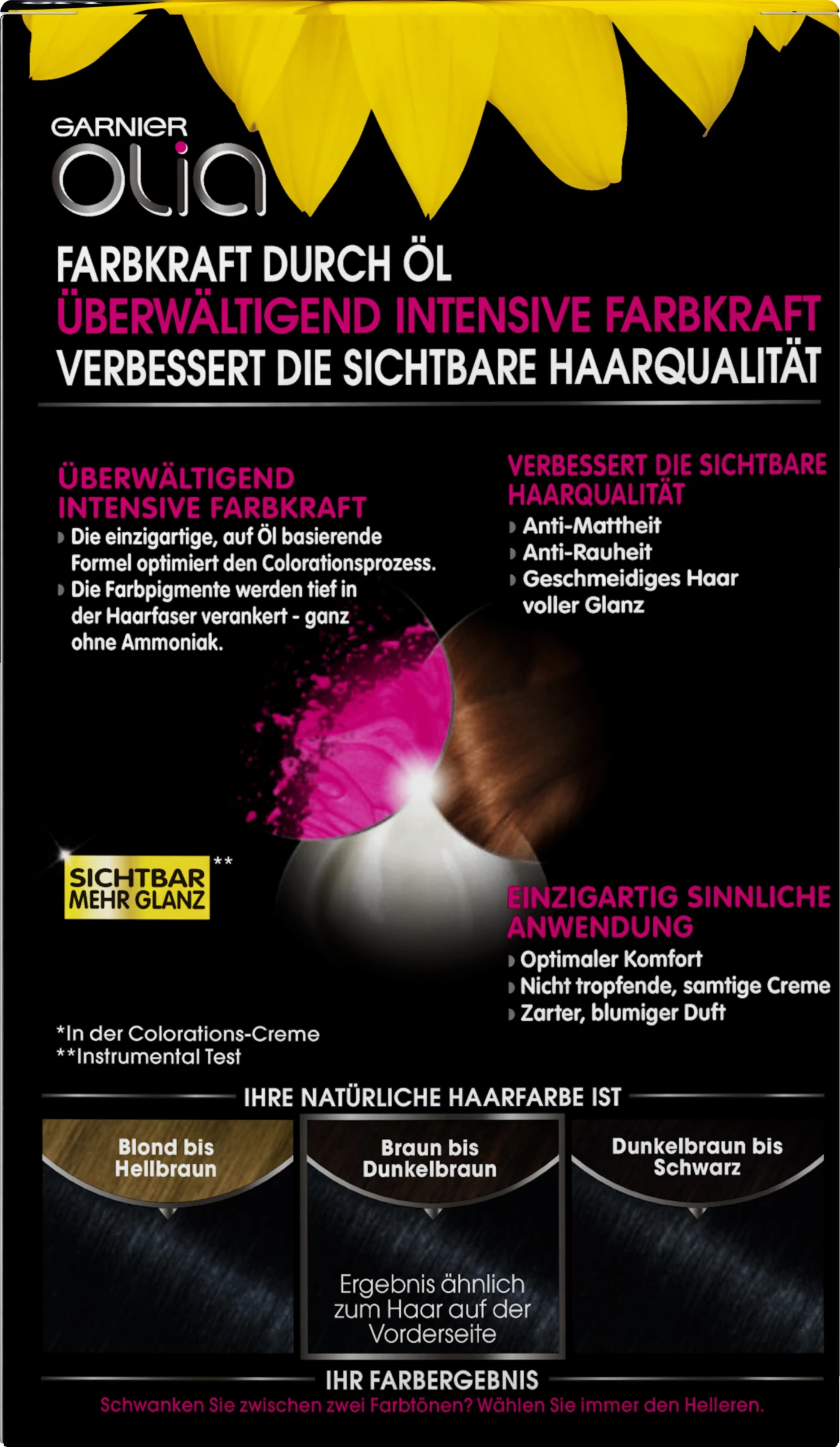 Garnier Olia Nr. 1.10 verleiht den Haaren ein langanhaltendes Blau Schwarz voller Glanz. Die dauerhafte Haarfarbe ohne Ammoniak für einen angenehmen Duft sorgt für intensive Farbkraft und geschmeidiges, glänzendes Haar. Die Colorations-Creme ist zu 60 % mit Ölen angereichert. Diese aktivieren die strahlende Kraft der Farbe, indem sie die hochwirksamen Pigmente tief in der Haarfaser verankern. Auch graues Haar wird zuverlässig abgedeckt. Gleichzeitig verwöhnt die Coloration das Haar mit reichhaltiger Pflege für eine sichtbar verbesserte Haarqualität. Die cremig-samtige Textur von Garnier Olia tropft nicht und lässt sich mühelos und gleichmäßig auftragen.