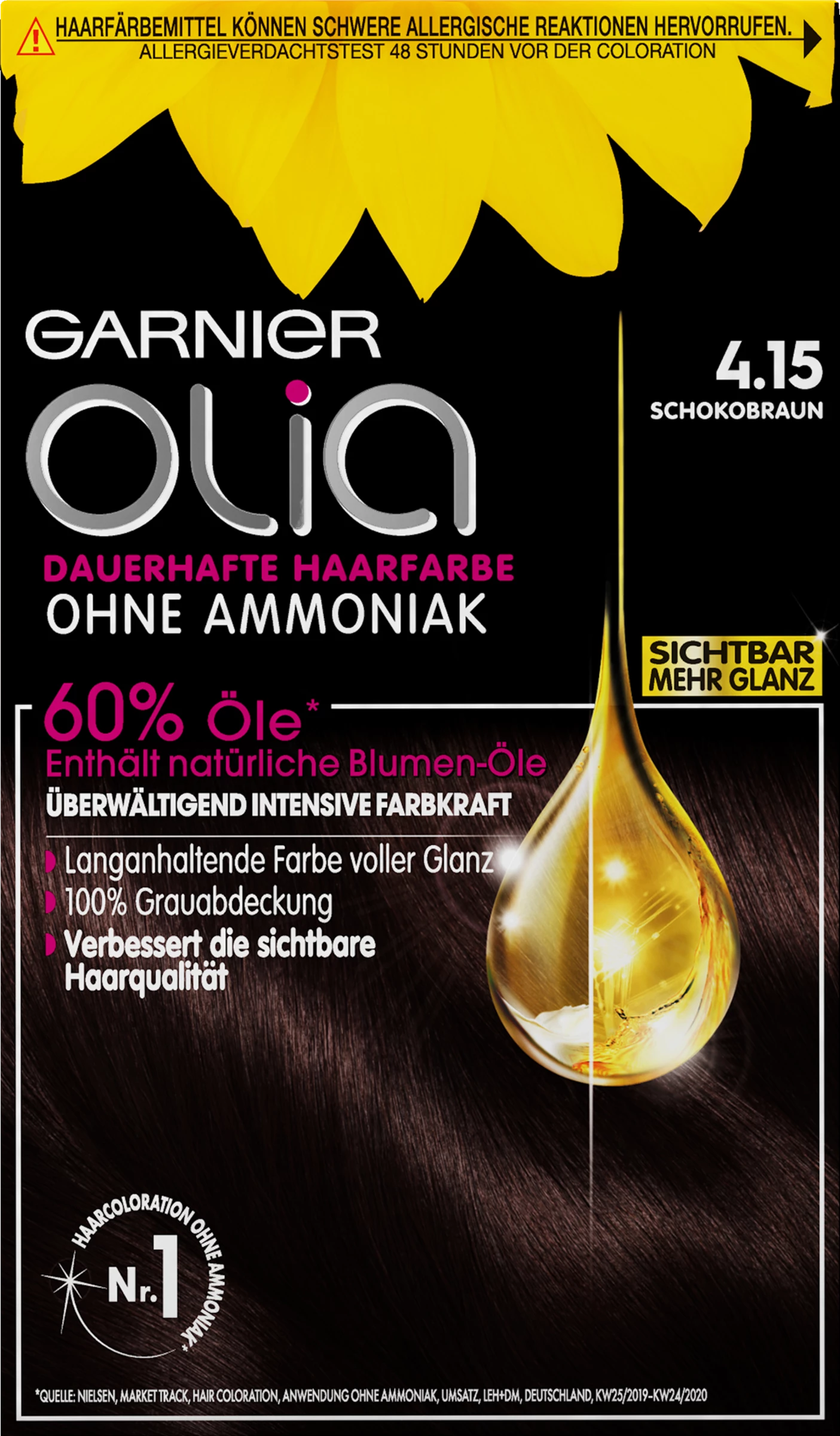 Garnier Olia Nr. 4.15 in Schokobraun verleiht den Haaren ein langanhaltendes, warmes Dunkelbraun. Die dauerhafte Haarfarbe ohne Ammoniak sorgt für intensive Farbkraft und geschmeidiges, glänzendes Haar. Die Colorations-Creme ist zu 60 % mit Ölen angereichert. Diese aktivieren die strahlende Kraft der Farbe, indem sie die hochwirksamen Pigmente tief in der Haarfaser verankern. Auch graues Haar wird zuverlässig abgedeckt.Gleichzeitig verwöhnt die Coloration das Haar mit reichhaltiger Pflege für eine sichtbar verbesserte Haarqualität.Die cremig-samtige Textur von Garnier Olia tropft nicht und lässt sich mühelos und gleichmäßig auftragen. Dabei entfaltet sie einen zart blumigen Duft.