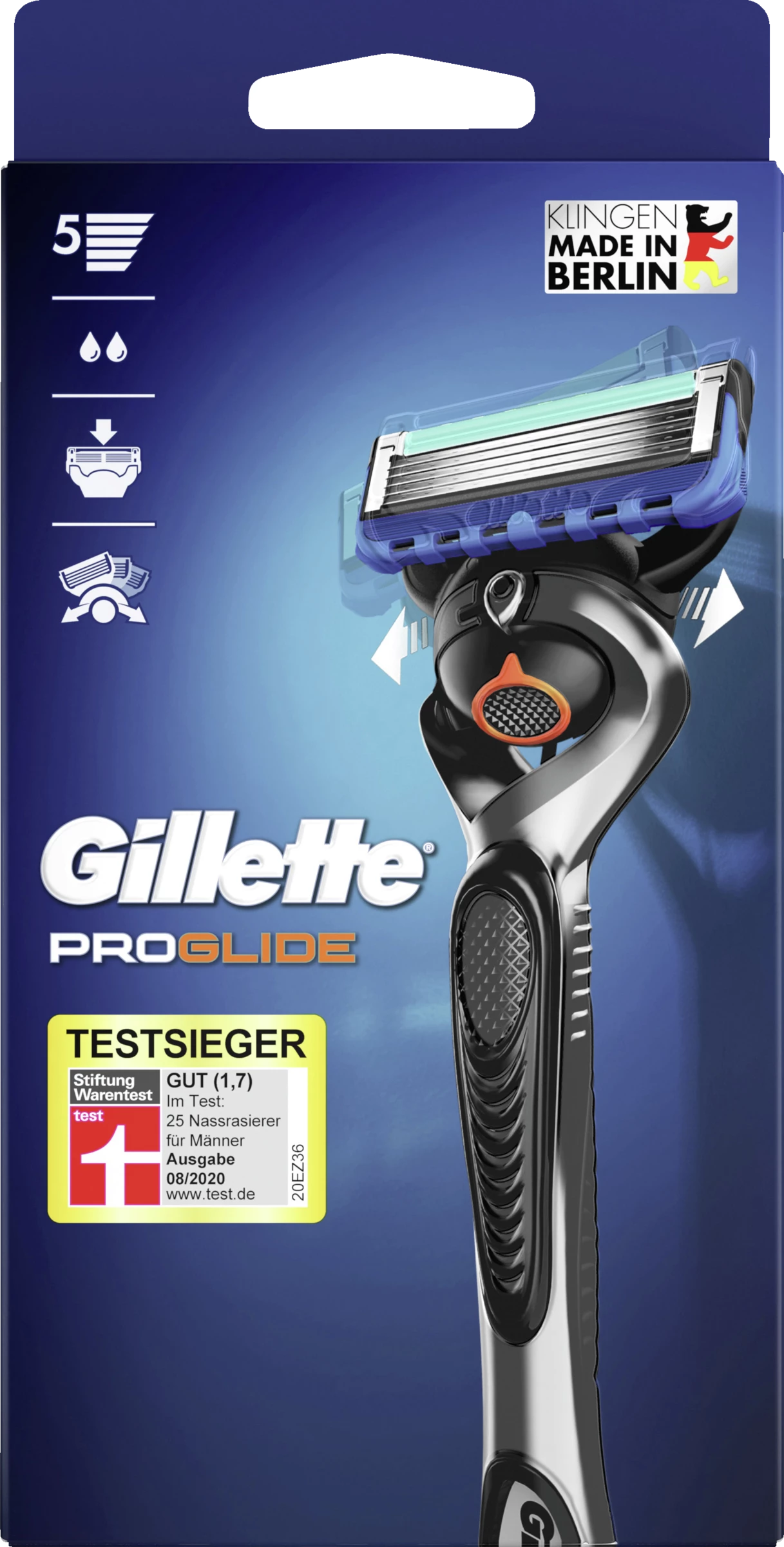 Der Gillette ProGlide Rasierer für Männer mit FlexBall-Technologie reagiert auf Konturen, für eine kompromisslose, gründliche und angenehme Rasur. Mit seinen eng gestaffelten Klingen sorgt er für unglaublichen Komfort. Der Präzisionstrimmer auf der Rückseite ermöglicht die Entfernungbesonders hartnäckiger Haare und filigrane Linien beim Styling.