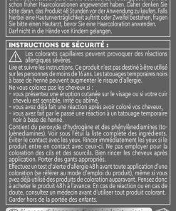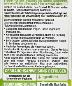 Nicht zur Färbung von Wimpern und Augenbrauen, nicht für eine andere Anwendung als zur Färbung der Kopfhaare verwenden. Nicht bei Kindern anwenden. Darf nicht in die Hände von Kindern gelangen. Sofort Augen spülen, falls das Erzeugnis mit den Augen in Berührung gekommen ist. Das Produkt lufttrocknen lassen – verwenden Sie keinen Fön, um ein Bröckeln des Produktes zu vermeiden. Farbreste auf der Haut können mit Wasser und Seife entfernt werden. Das Farbergebnis ist abhängig von Ihrer Ausgangshaafarbe.