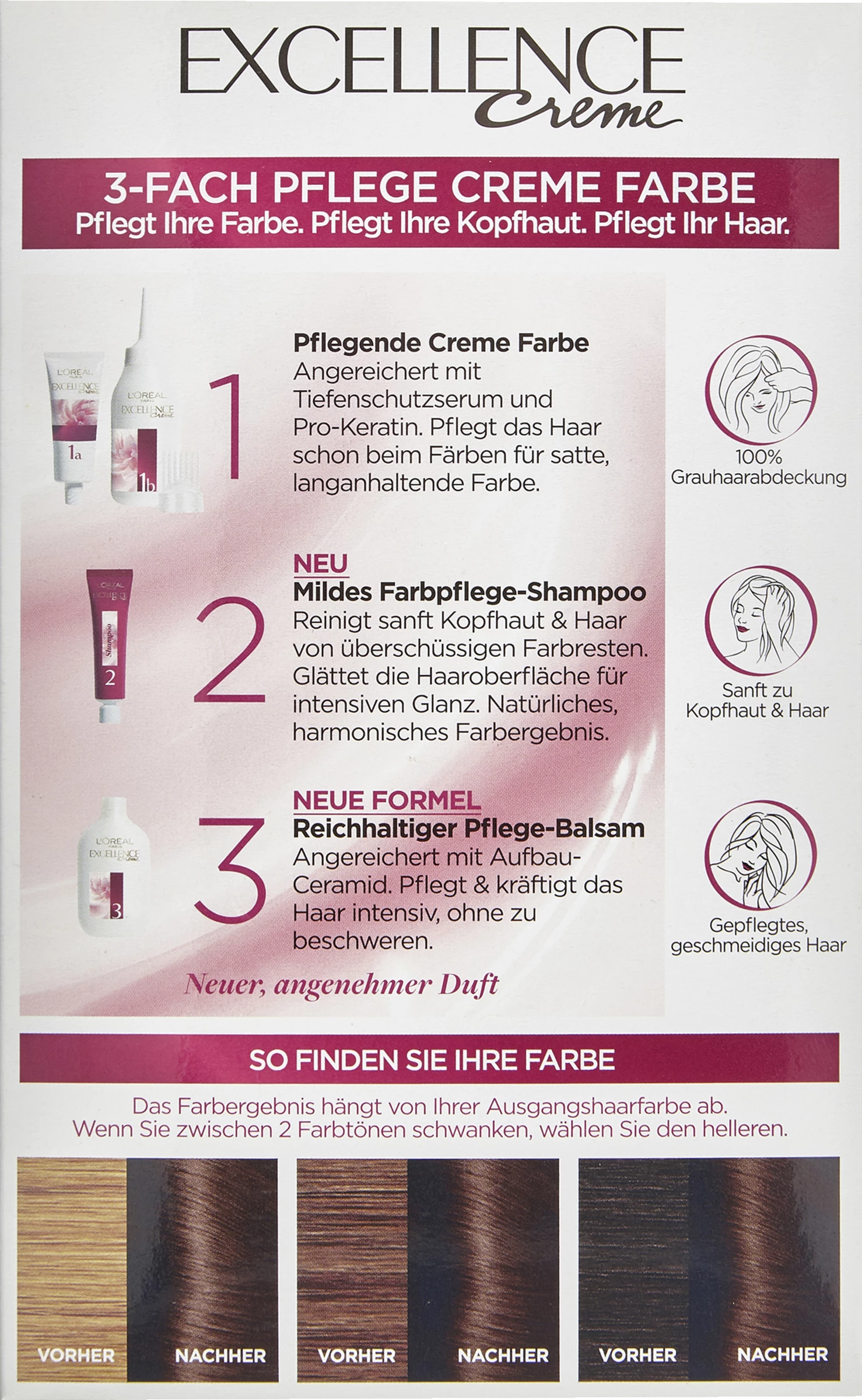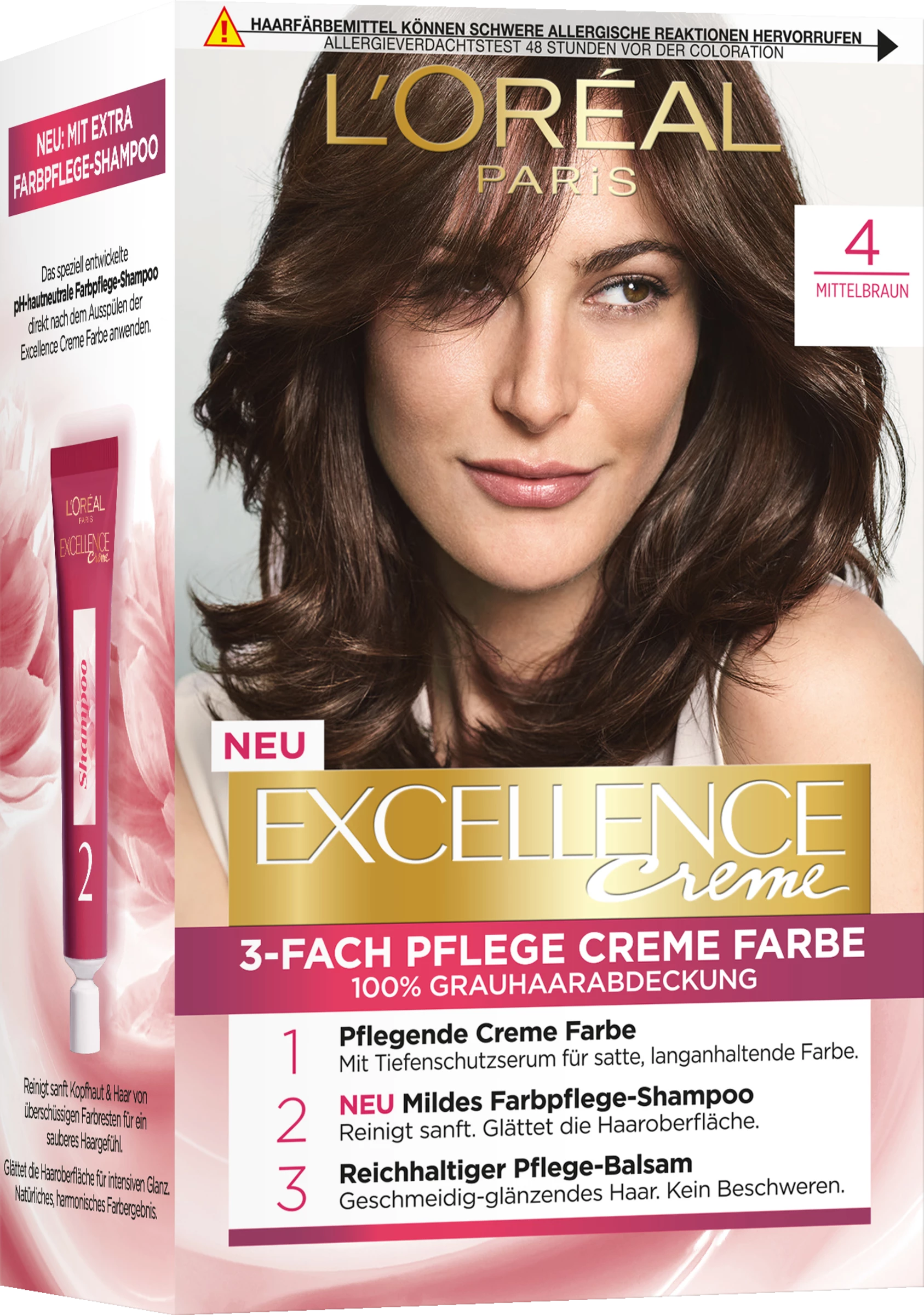 L’Oréal Paris Excellence Crème 4 Mittelbraun ist eine 3-fach Pflege Creme Farbe angereichert mit Tiefenschutzserum, Pro-Keratin und Aufbau-Ceramid für kräftiges, geschütztes Haar und eine langanhaltende glänzende Farbe. Jetzt neu: mit Farbpflege-Shampoo!