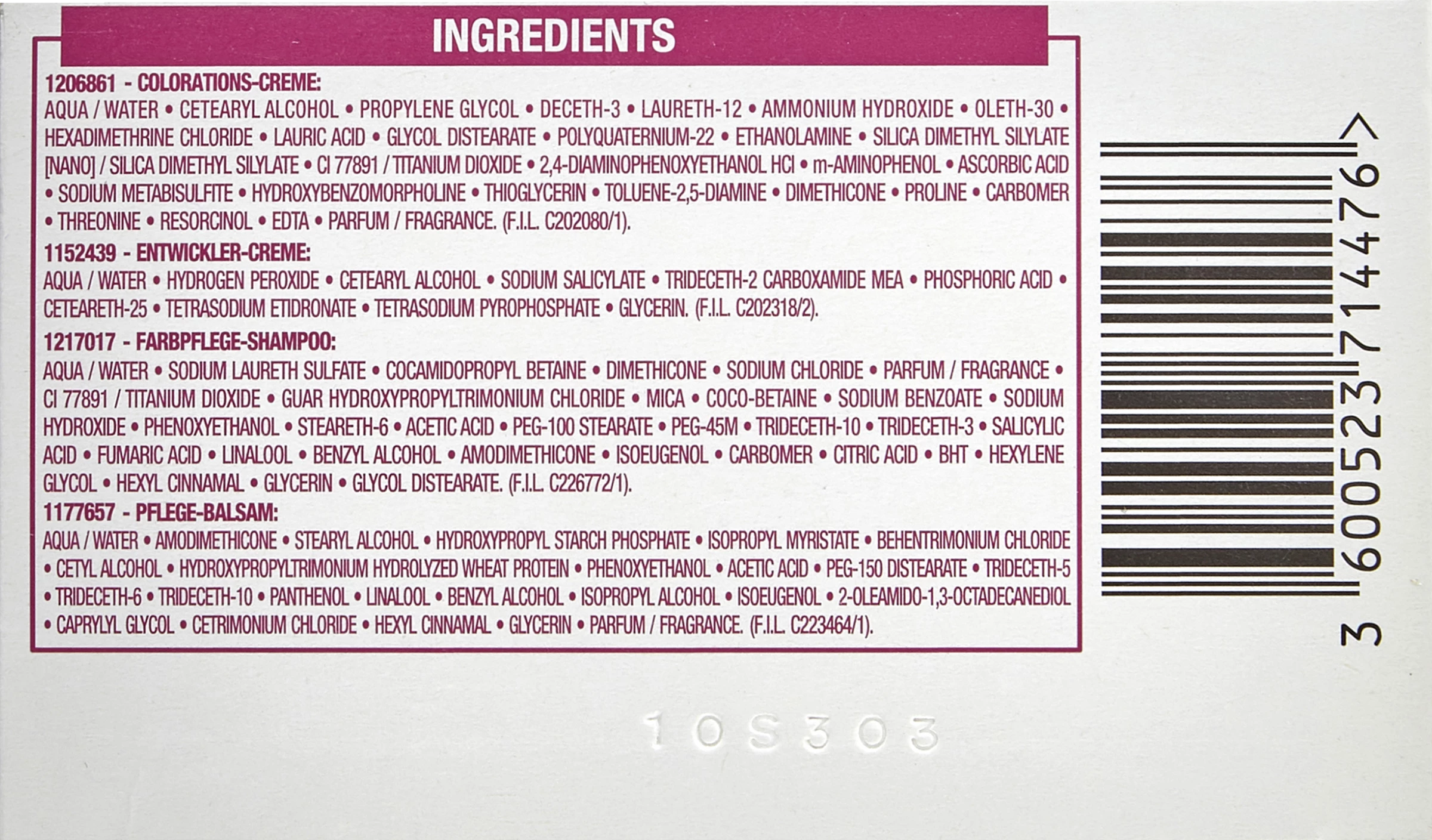1206861 – INGREDIENTS: AQUA / WATER • CETEARYL ALCOHOL • PROPYLENE GLYCOL • DECETH-3 • LAURETH-12 • AMMONIUM HYDROXIDE • OLETH-30 • HEXADIMETHRINE CHLORIDE • LAURIC ACID • GLYCOL DISTEARATE • POLYQUATERNIUM-22 • ETHANOLAMINE • SILICA DIMETHYL SILYLATE [NANO] / SILICA DIMETHYL SILYLATE • CI 77891 / TITANIUM DIOXIDE • 2,4-DIAMINOPHENOXYETHANOL HCl • m-AMINOPHENOL • ASCORBIC ACID • SODIUM METABISULFITE • HYDROXYBENZOMORPHOLINE • THIOGLYCERIN • TOLUENE-2,5-DIAMINE • DIMETHICONE • PROLINE • CARBOMER • THREONINE • RESORCINOL • EDTA • PARFUM / FRAGRANCE (F.I.L. C202080/1).1152439 – INGREDIENTS: AQUA / WATER • HYDROGEN PEROXIDE • CETEARYL ALCOHOL • SODIUM SALICYLATE • TRIDECETH-2 CARBOXAMIDE MEA • PHOSPHORIC ACID • CETEARETH-25 • TETRASODIUM ETIDRONATE • TETRASODIUM PYROPHOSPHATE • GLYCERIN (F.I.L. C202318/2).1217017 B – INGREDIENTS AQUA / WATER • SODIUM LAURETH SULFATE • COCAMIDOPROPYL BETAINE • DIMETHICONE • SODIUM CHLORIDE • PARFUM / FRAGRANCE • CI 77891 / TITANIUM DIOXIDE • GUAR HYDROXYPROPYLTRIMONIUM CHLORIDE • MICA • COCO-BETAINE • SODIUM BENZOATE • SODIUM HYDROXIDE • PHENOXYETHANOL • STEARETH-6 • ACETIC ACID • PEG-100 STEARATE • TRIDECETH-10 • TRIDECETH-3 • SALICYLIC ACID • FUMARIC ACID • LINALOOL • BENZYL ALCOHOL • AMODIMETHICONE • ISOEUGENOL • CARBOMER • CITRIC ACID • HEXYLENE GLYCOL • HEXYL CINNAMAL • GLYCERIN • GLYCOL DISTEARATE. (F.I.L. C235641/1)1177657 – INGREDIENTS: AQUA / WATER • AMODIMETHICONE • STEARYL ALCOHOL • HYDROXYPROPYL STARCH PHOSPHATE • ISOPROPYL MYRISTATE • BEHENTRIMONIUM CHLORIDE • CETYL ALCOHOL • HYDROXYPROPYLTRIMONIUM HYDROLYZED WHEAT PROTEIN • PHENOXYETHANOL • ACETIC ACID • PEG-150 DISTEARATE • TRIDECETH-5 • TRIDECETH-6 • TRIDECETH-10 • PANTHENOL • LINALOOL • BENZYL ALCOHOL • ISOPROPYL ALCOHOL • ISOEUGENOL • 2-OLEAMIDO-1,3-OCTADECANEDIOL • CAPRYLYL GLYCOL • CETRIMONIUM CHLORIDE • HEXYL CINNAMAL • GLYCERIN • PARFUM / FRAGRANCE (F.I.L. C223464/1).