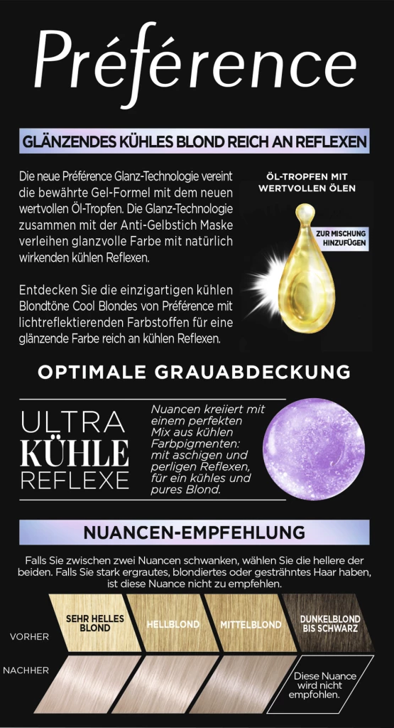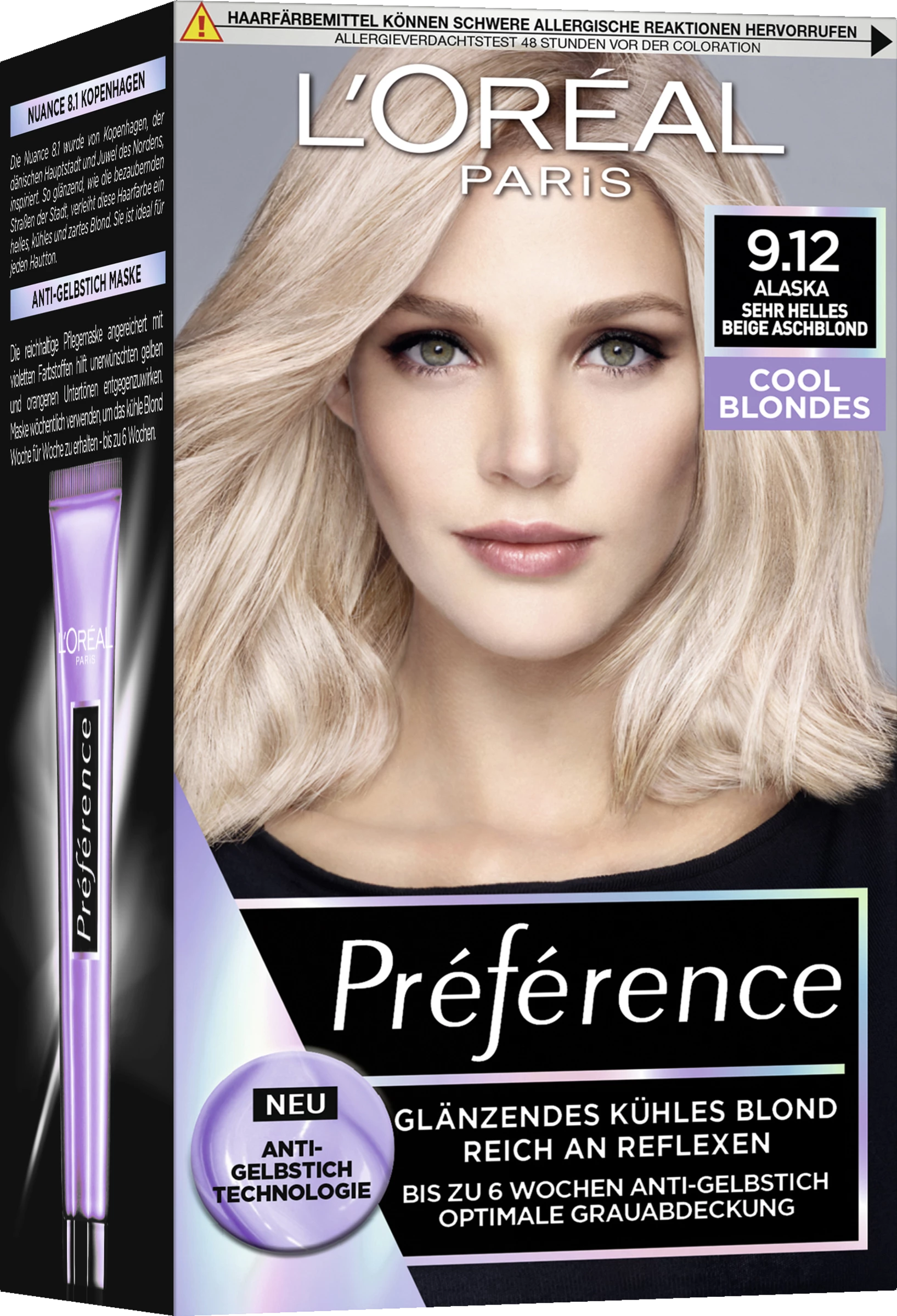 Die neue Préférence Glanz-Technologie vereint die bewährte Gel-Formel mit dem neuen wertvollen Öl-Tropfen. Die Glanz-Technologie zusammen mit der Anti-Gelbstich Maske verleihen glanzvolle Farbe mit natürlich wirkenden kühlen Reflexen.Die Nuance 9.12 wurde von Alaska inspiriert, dem eisigen Diamenten des Nordens. Das pure, atemberaubende Blond wurde von den kühlen Weiten der Eiswelten Alaskas inspiriert.Die beigefügte reichhaltige Pflegemaske angereichert mit violetten Farbstoffen hilft unerwünschten gelben und orangen Untertönen entgegenzuwirken.