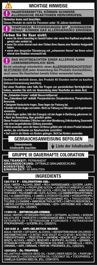 HAARFÄRBEMITTEL KÖNNEN SCHWERE ALLERGISCHE REAKTIONEN HERVORRUFEN. Hinweise lesen und beachten: Dieses Produkt ist nicht für Personen unter 16 Jahren bestimmt.Temporäre Tätowierungen mit “schwarzem Henna” können das Allergierisiko erhöhen. Färben Sie Ihr Haar nicht, wenn Sie einen Ausschlag im Gesicht haben oder wenn Ihre Kopfhaut empfindlich, gereizt oder verletzt ist; wenn Sie schon einmal nach dem Färben Ihres Haares eine Reaktion festgestellt haben; wenn eine temporäre Tätowierung mit “schwarzem Henna” bei Ihnen schon einmal eine Reaktion verursacht hat. DAS NICHTBEACHTEN EINER ALLERGIE KANN LEBENSBEDROHLICH SEIN. ES IST UNBEDINGT ERFORDERLICH, EINEN ALLERGIEVERDACHTSTEST 48 STUNDEN VOR JEDER ANWENDUNG DES PRODUKTES DURCHZUFÜHREN, AUCH WENN SIE HAARFARBEN BEREITS FRÜHER VERWENDET HABEN. DENKEN SIE DESHALB DARAN, DAS PRODUKT 48 STUNDEN VORHER ZU KAUFEN. (Gebrauchsanweisung beachten).Bei einer Reaktion oder falls Sie Fragen zur persönlichen Verträglichkeit haben, wenden Sie sich vor der Anwendung einer Haarfarbe an einen Arzt. Die “Entwickler-Creme” enthält Wasserstoffperoxid. Das “Colorations-Gel” enthält: Phenylendiamine (Toluylendiamine), Phenylendiamin, Ammoniak. Geeignete Handschuhe tragen. Diese liegen der Packung bei. Kontakt mit den Augen vermeiden. Nicht zur Färbung von Wimpern und Augenbrauen verwenden. Sofort Augen spülen, falls das Erzeugnis mit den Augen in Berührung gekommen ist. Nach der Anwendung die Haare gut spülen. Dieses Produkt frühestens 2 Wochen nach einer Blondierung, Entkräuselung, Dauerwelle oder einer langanhaltenden Glättung anwenden. Nicht anwenden, wenn Ihre Haare mit Henna gefärbt oder mit einem Produkt behandelt wurden, das schrittweise zur natürlichen Haarfarbe zurückführt. Darf nicht in die Hände von Kindern gelangen. Nicht bei Kindern anwenden. Gebrauchsanweisung befolgen.