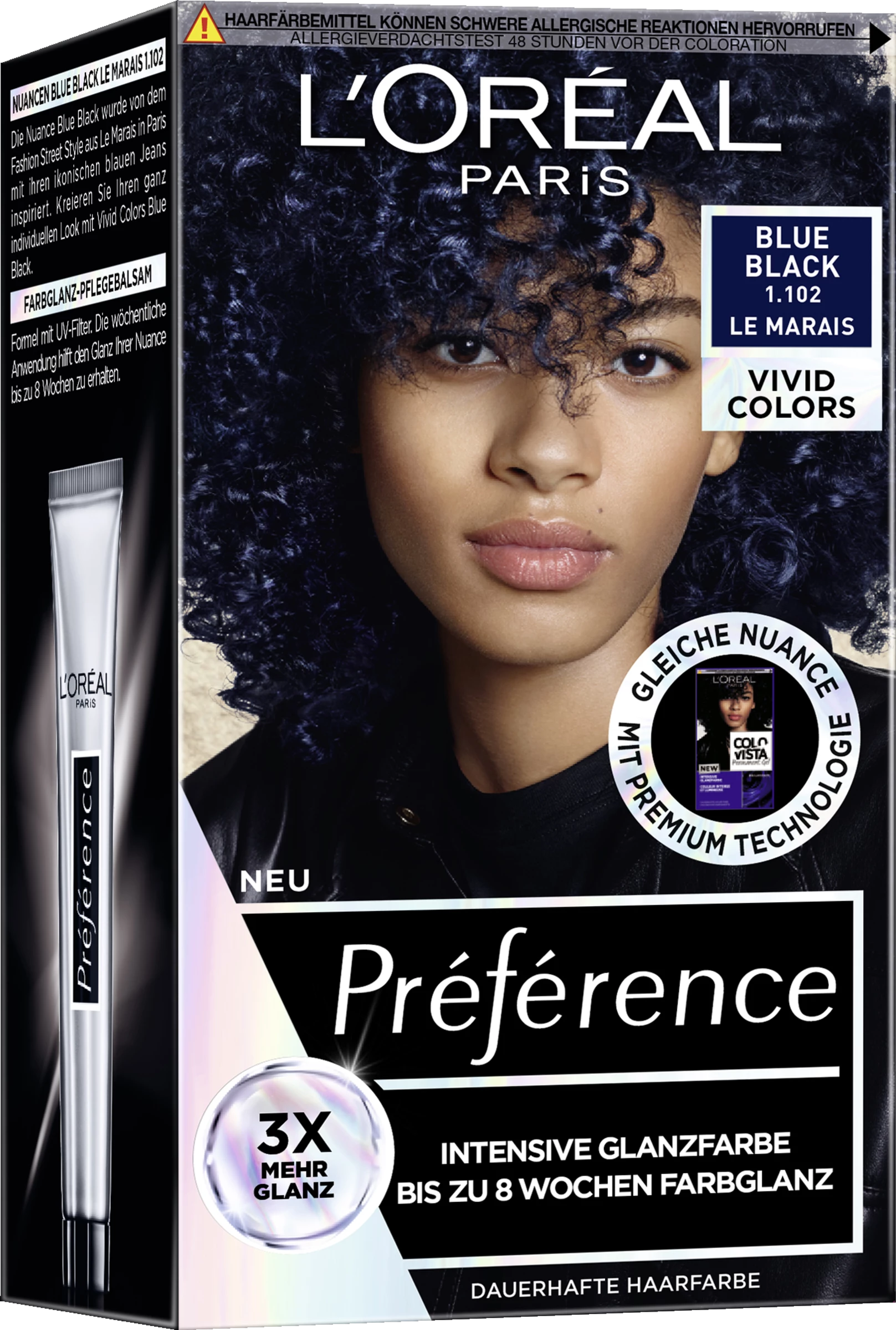 Entdecken Sie unsere innovative Préférence Expertise jetzt bei den Vivid Colors. Die Formel besticht durch eine Mischung aus leistungsstarken Farbstoffen – ausgewählt von unseren Haarfärbeexperten für hochintensive, schimmernde Farben. Die Gel Textur ist für alle Haartypen geeignet und ermöglicht durch ein 150ml Mix-Kit eine spielend leichte Anwendung.Der Farbglanz-Pflegebalsam mit UV-Filter erhält den Glanz Ihrer Nuance bis zu 8 Wochen bei wöchentlicher Anwendung.Die Nuance Blue Black wurde von dem Fashio Street Style aus Le Marais in Paris mit ihren ikonischen blauen Jeans inspiriert und kreiert einen ganz individuellen Look.