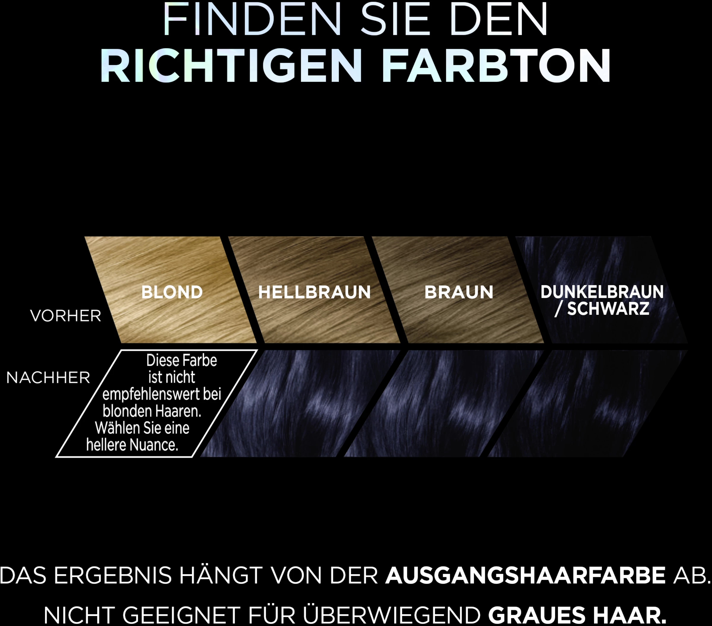 HAARFÄRBEMITTEL KÖNNEN SCHWERE ALLERGISCHE REAKTIONEN HERVORRUFEN. Hinweise lesen und beachten. Dieses Produkt ist nicht für Personen unter 16 Jahren bestimmt. Temporäre Tätowierungen mit “schwarzem Henna” können das Allergierisiko erhöhen. Färben Sie Ihr Haar nicht, wenn Sie einen Ausschlag im Gesicht haben oder wenn Ihre Kopfhaut empfindlich, gereizt oder verletzt ist; wenn Sie schon einmal nach dem Färben Ihres Haares eine Reaktion festgestellt haben; wenn eine temporäre Tätowierung mit “schwarzem Henna” bei Ihnen schon einmal eine Reaktion verursacht hat. DAS NICHTBEACHTEN EINER ALLERGIE KANN LEBENSBEDROHLICH SEIN. ES IST UNBEDINGT ERFORDERLICH, EINEN ALLERGIEVERDACHTSTEST 48 STUNDEN VOR JEDER ANWENDUNG DES PRODUKTES DURCHZUFÜHREN, AUCH WENN SIE HAARFARBEN BEREITS FRÜHER VERWENDET HABEN. DENKEN SIE DESHALB DARAN, DAS PRODUKT 48 STUNDEN VORHER ZU KAUFEN. (Gebrauchsanweisung beachten).Bei einer Reaktion oder falls Sie Fragen zur persönlichen Verträglichkeit haben, wenden Sie sich vor der Anwendung einer Haarfarbe an einen Arzt. Die “Entwickler-Creme” enthält Wasserstoffperoxid. Das “Colorations-Gel” enthält: Ammoniak, Phenylendiamine (Toluylendiamine), Phenylendiamine. Geeignete Handschuhe tragen. Diese liegen der Packung bei. Kontakt mit den Augen vermeiden. Nicht zur Färbung von Wimpern und Augenbrauen verwenden. Sofort Augen spülen, falls das Erzeugnis mit den Augen in Berührung gekommen ist. Nach der Anwendung die Haare gut spülen. Dieses Produkt frühestens 15 Tage nach einer Blondierung, Entkräuselung, Dauerwelle oder einer langanhaltenden Glättung anwenden. Nicht anwenden, wenn die Haare mit Henna gefärbt oder mit einem Produkt behandelt wurden, das schrittweise zur Naturhaarfarbe zurückführt. Darf nicht in die Hände von Kindern gelangen. Nicht bei Kindern anwenden. Gebrauchsanweisung befolgen.