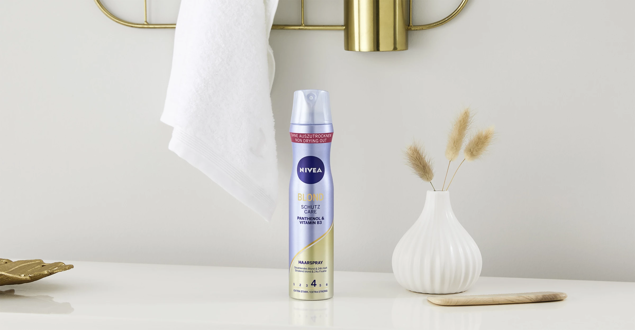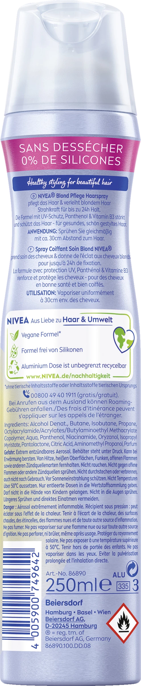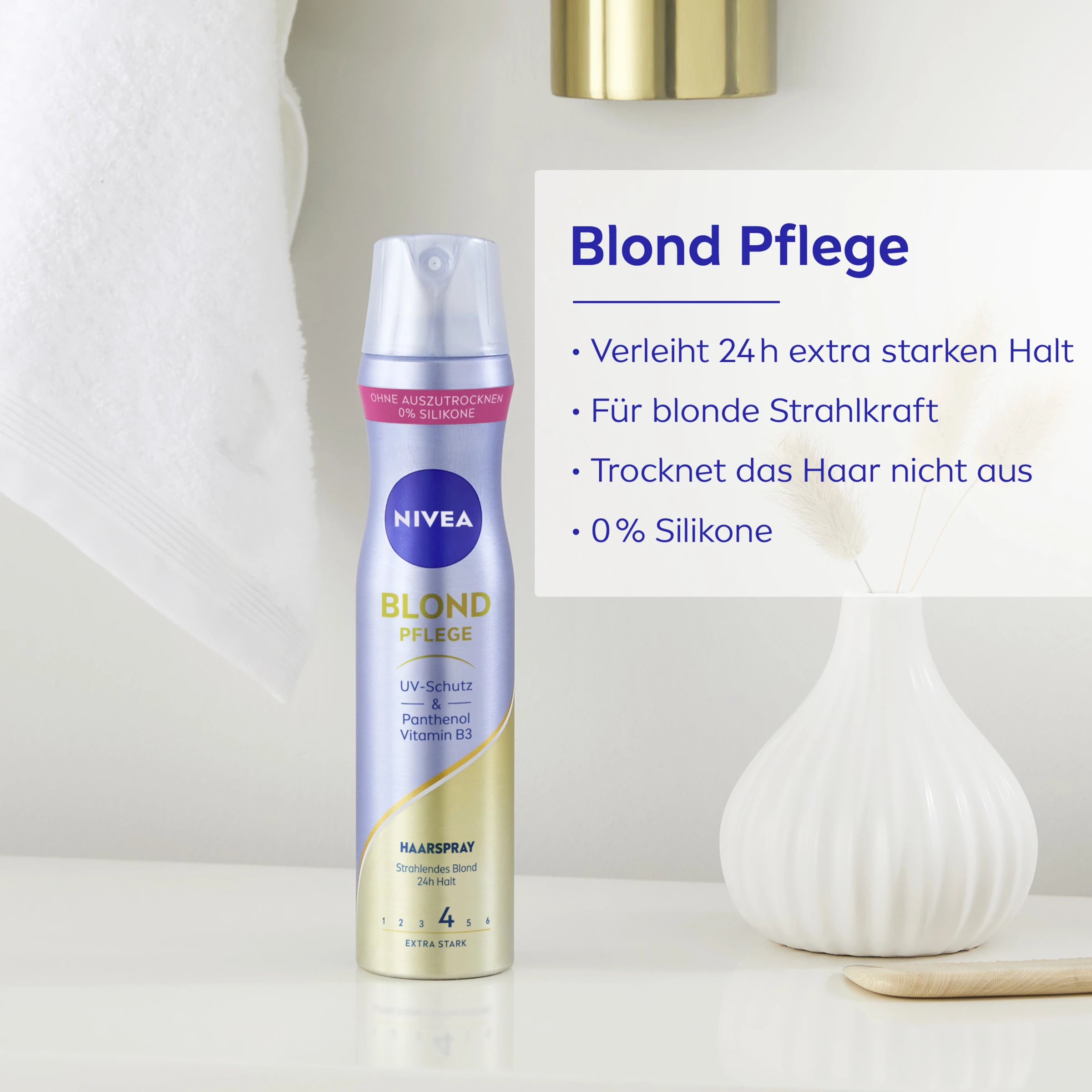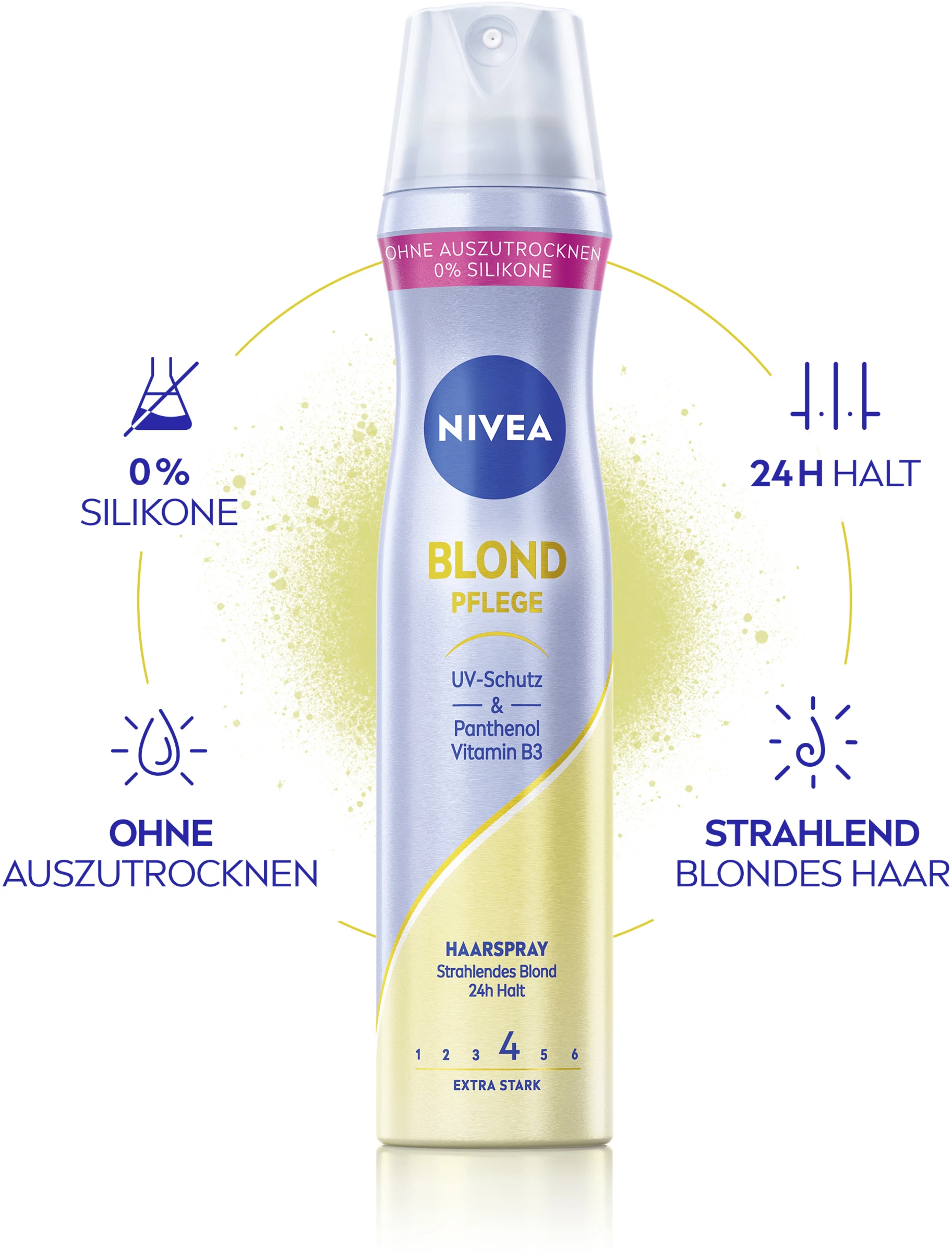 Stylen Sie Ihr blondes Haar und verleihen Sie ihm ein perfektes Finish. Das Haarspray mit Panthenol und Vitamin B3 fixiert die perfekte Frisur für einen extra starken 24 Stunden Halt. Ob ein frecher Pixie-Cut, ein klassischer Bob oder eine lange Lockenmähne – blondes Haar bekommt einen farberfrischenden Glanz. Für strahlend schöne Blondinen: Blond Schutz Haarspray. Die Styling-Formel von NIVEA mit Panthenol und Vitamin B3 stärkt und schützt das Haar. Ohne auszutrocknen – einfach schön gestyltes Haar.