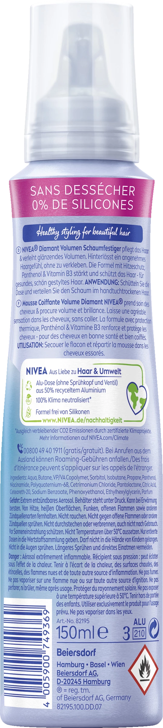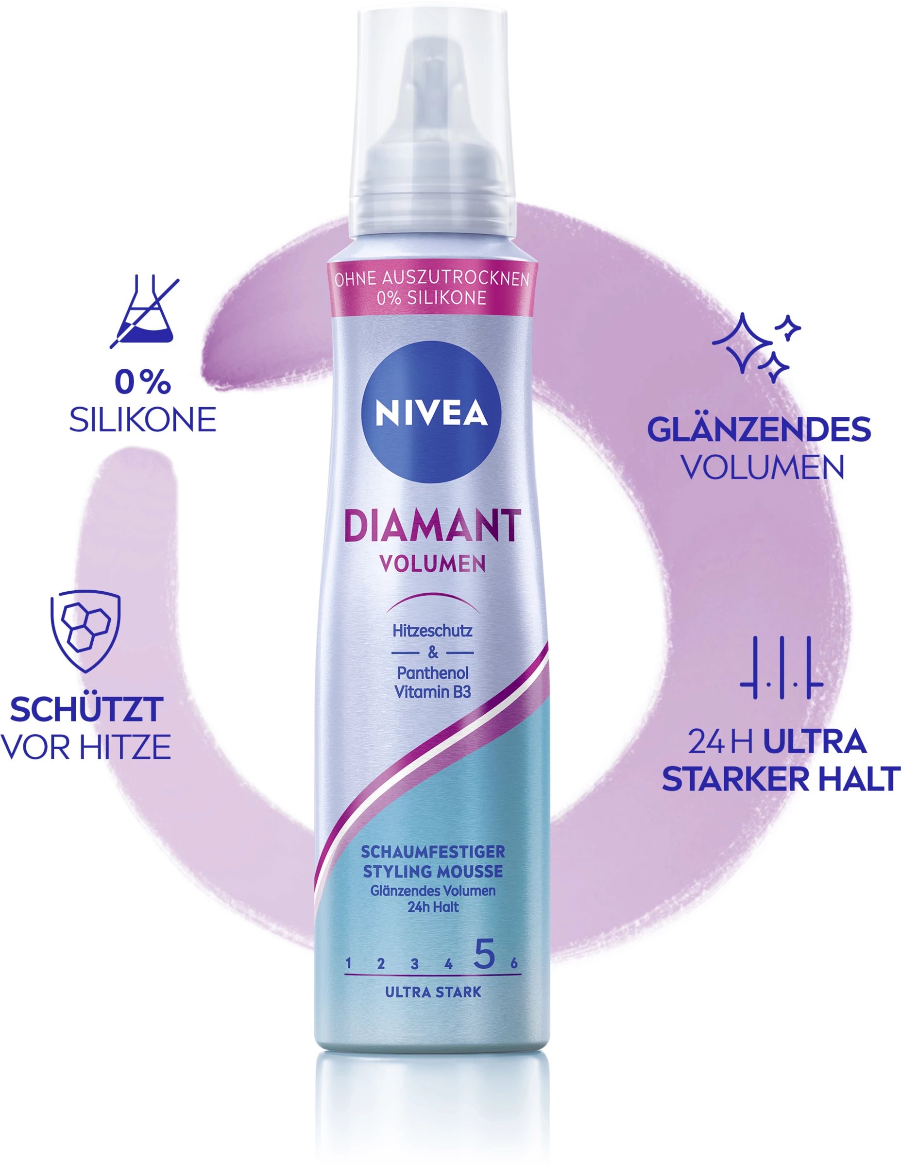 Der Schaumfestiger mit Panthenol und Vitamin B3 für Diamant Volumen pflegt das Haar beim Frisieren. Die leicht funkelnde Textur verleiht dem Haar schwerelose Fülle, Glanz und eine schöne Ausstrahlung. Der Haarschaum für Volumen und einen glamourösen Look: Diamant Volumen Schaumfestiger. Die Styling-Formel von NIVEA mit Panthenol und Vitamin B3 stärkt und schützt das Haar. Ohne auszutrocknen – einfach schön gestyltes Haar.