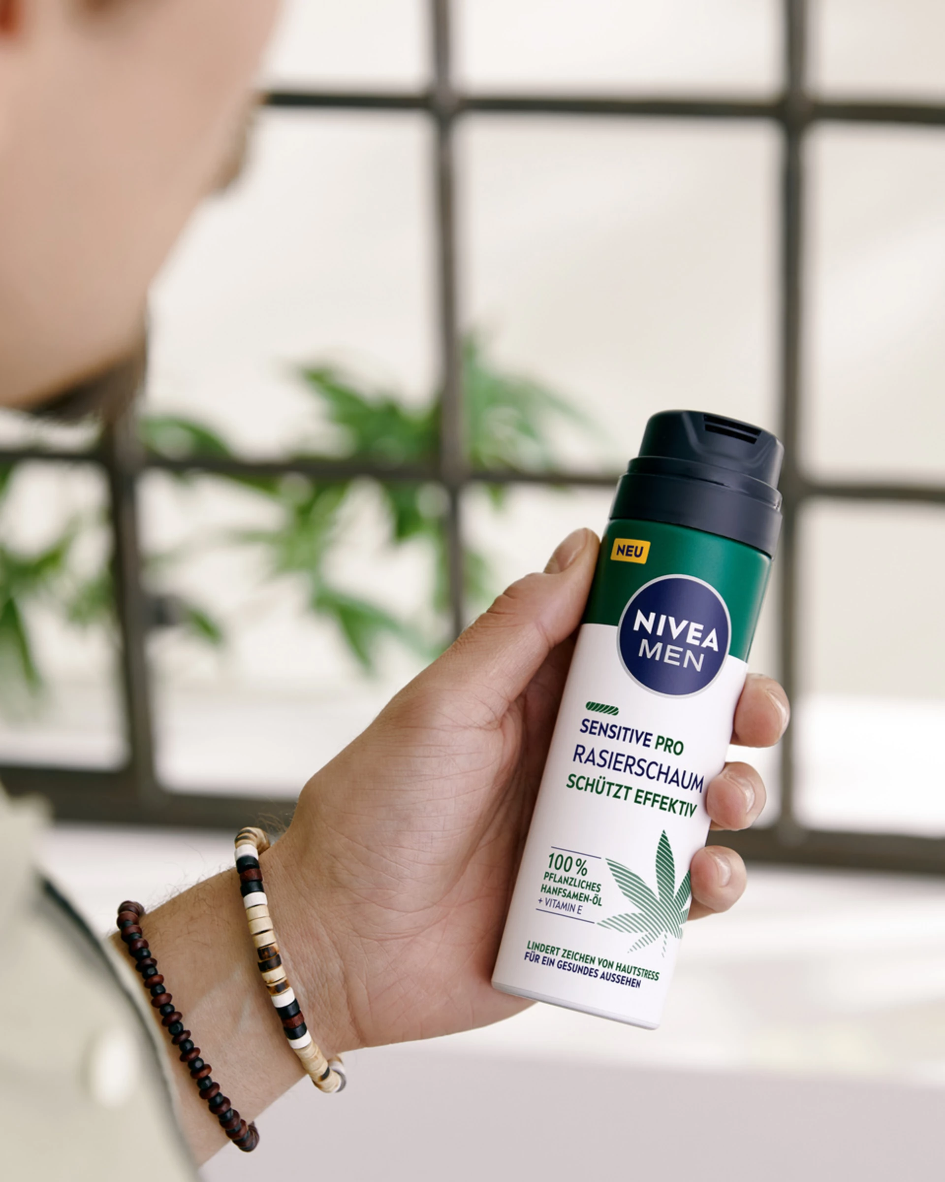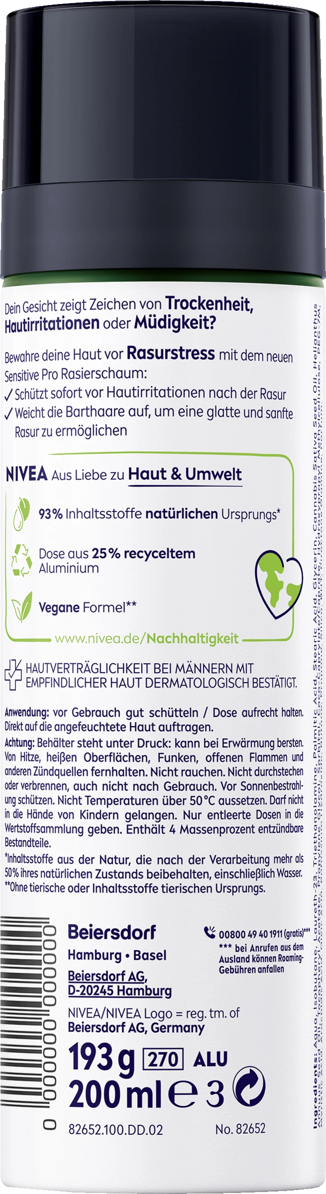 Der NIVEA MEN SENSITIVE PRO Rasierschaum schützt sofort vor Hautirritationen und weicht die Barthaare auf. Trockenheit, Hautirritationen, Müdigkeit und andere Zeichnen von Hautstress werden gelindert. Der Sensitive Pro Rasierschaum sorgt für eine natürliche Rasur und eine gesund aussehende Haut. Diese vegane* Formel für Männer beinhaltet 100% pflanzliches Hanfsamen-Öl und Vitamin E. 93% der Inhaltstoffe haben einen natürlichen Ursprung. Aus Liebe zur Haut und Umwelt ist die Dose aus 25% recyceltem Aluminium. HAUTVERTRÄGLICHKEIT BEI MÄNNERN MIT EMPFINDLICHER HAUT DERMATOLOGISCH BESTÄTIGT.
