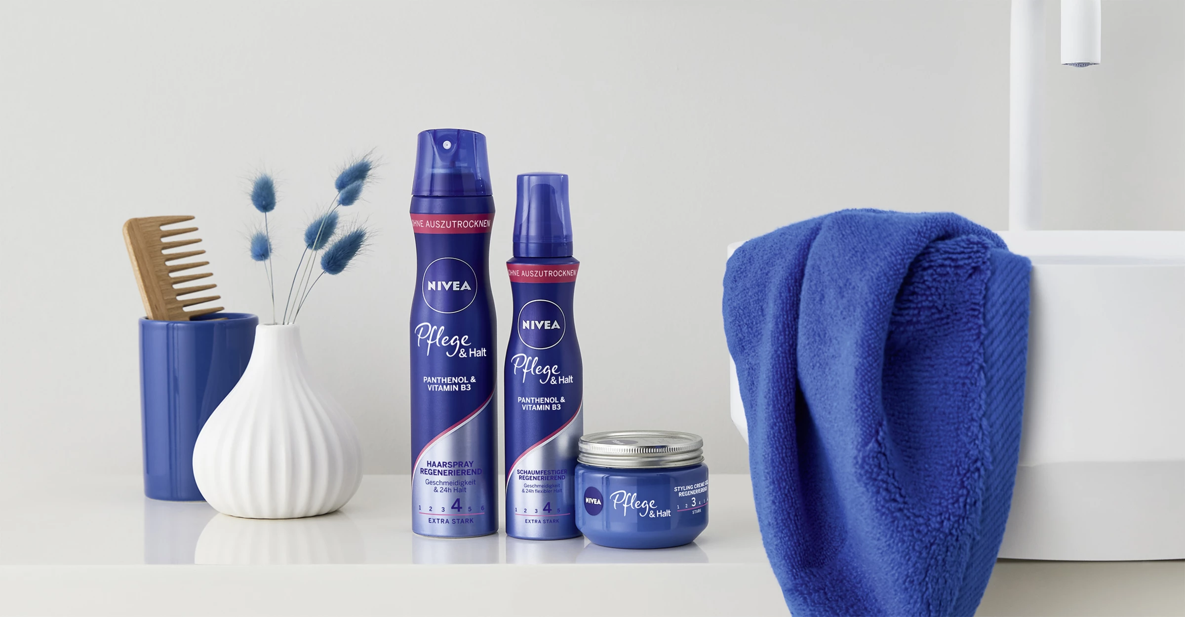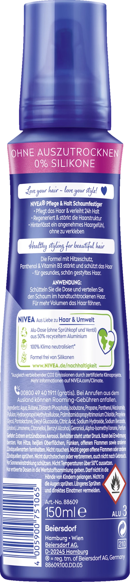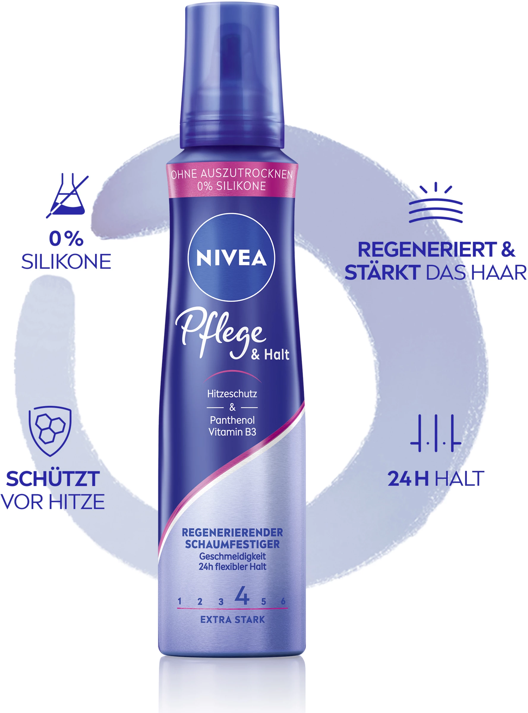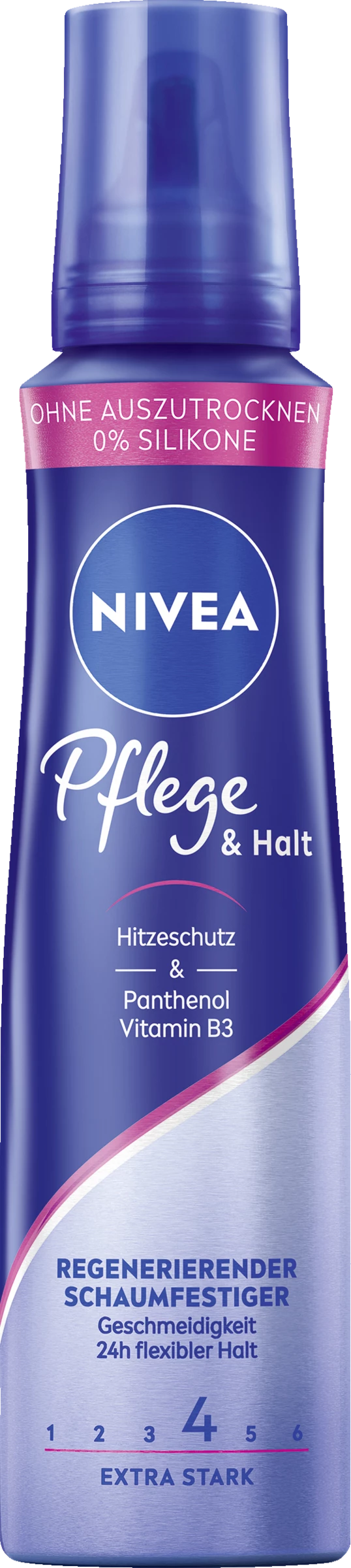 Das 1. Pflegestyling: NIVEA Pflege & Halt Schaumfestiger regeneriert das Haar und bietet 24h Halt und Geschmeidigkeit. Die Formel mit dem innovativen Vitamin-Pflege-Komplex aus Panthenol und Vitamin B3 regeneriert und stärkt die Haarstruktur. Sie beschwert nicht und schützt das Haar vor Hitzeschäden. Für gepflegt gestyltes Haar: Pflege & Halt Schaumfestiger. Ohne auszutrocknen – einfach schön gestyltes Haar.