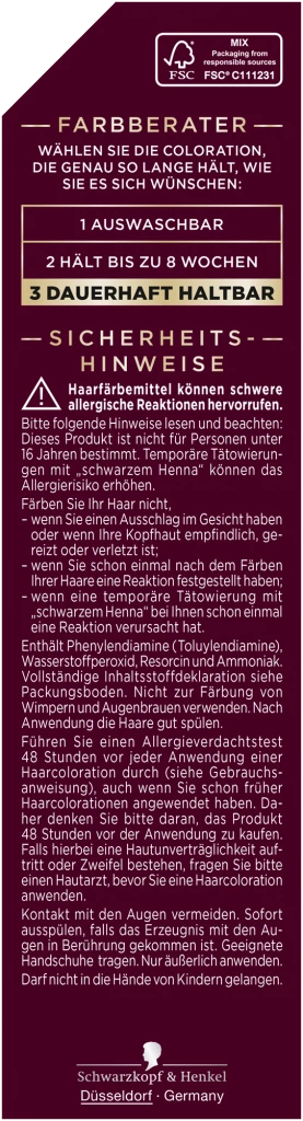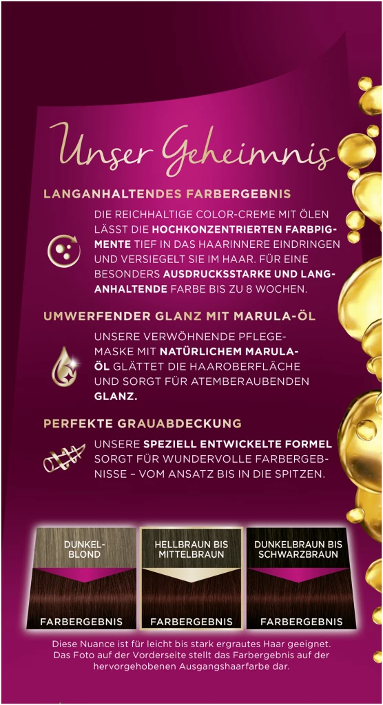 Die reichhaltige Color-Creme mit Ă–len lässt die hochkonzentrierten Farbpigmente tief in das Haarinnere eindringen und versiegelt sie im Haar. FĂĽr eine besonders ausdrucksstarke und langanhaltende Farbe bis zu 8 Wochen. Unsere verwöhnende Pflegemaske mit natĂĽrlichem Marula-Ă–l glättet die Haaroberfläche uns sorgt fĂĽr atemberaubenden Glanz. Unsere speziell entwickelte Formel sorgt fĂĽr wundervolle Farbergebnisse – vom Ansatz bis in die Spitzen.