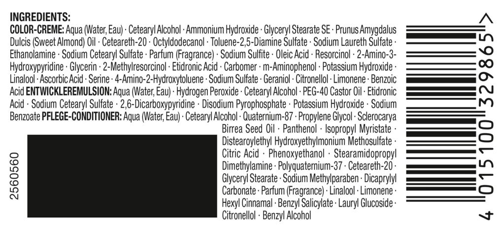 Color-Creme: Aqua (Water/Eau), Cetearyl Alcohol, Ammonium Hydroxide, Glyceryl Stearate SE, Prunus Amygdalus Dulcis (Sweet Almond) Oil, Ceteareth-20, Octyldodecanol, Toluene-2,5-Diamine Sulfate, Sodium Laureth Sulfate, Ethanolamine, Sodium Cetearyl Sulfate, Parfum (Fragrance), Sodium Sulfite, Oleic Acid, Resorcinol, 2-Amino-3-Hydroxypyridine, Glycerin, 2-Methylresorcinol, Etidronic Acid, Carbomer, m-Aminophenol, Potassium Hydroxide, Linalool, Ascorbic Acid, Serine, 4-Amino-2-Hydroxytoluene, Sodium Sulfate, Geraniol, Citronellol, Limonene, Benzoic Acid.