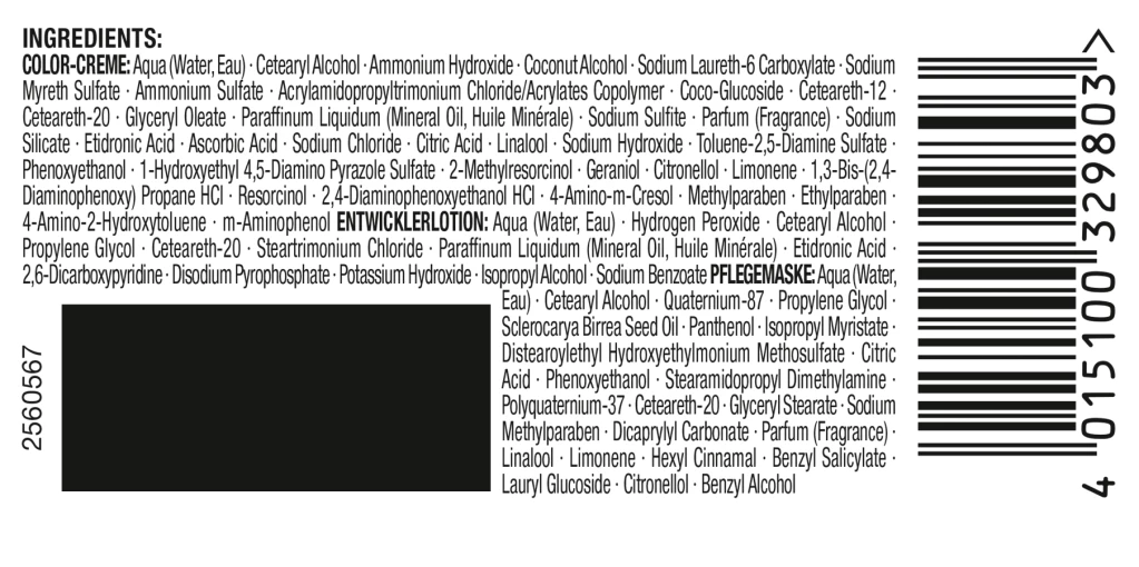 Aqua, Cetearyl Alcohol, Ammonium Hydroxide, Coconut Alcohol, Sodium Laureth-6 Carboxylate, Sodium Myreth Sulfate, Ammonium Sulfate, Acrylamidopropyltrimonium Chloride/Acrylates Copolymer, Coco-Glucoside, Ceteareth-12, Ceteareth-20, Glyceryl Oleate, Paraffinum Liquidum, Sodium Sulfite, Parfum, Sodium Silicate, Etidronic Acid, Ascorbic Acid, Sodium Chloride, Citric Acid, Linalool, Sodium Hydroxide, Toluene-2,5-Diamine Sulfate, Phenoxyethanol, 1-Hydroxyethyl 4,5-Diamino Pyrazole Sulfate, 2-Methylresorcinol, Geraniol, Citronellol, Limonene, 1,3-Bis-(2,4-Diaminophenoxy) Propane HCl, Resorcinol, 2,4-Diaminophenoxyethanol HCl, 4-Amino-m-Cresol, Methylparaben, Ethylparaben, 4-Amino-2-Hydroxytoluene, m-Aminophenol