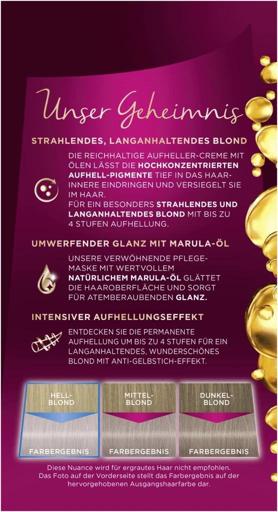 Die reichhaltige Aufheller-Creme mit Ölen lässt die hochkonzentrierten Aufhell-Pigmente tief in das Haarinnere eindringen und versiegelt sie im Haar. Für eine besonders ausdrucksstarke und langanhaltende Farbe bis zu 8 Wochen Unsere verwöhnende Pflegemaske mit wertvollem natürlichen Marula-Öl glättet die Haaroberfläche und sorgt für atemberaubenden Glanz. Unsere speziell entwickelte Formel sorgt für wundervolle Farbergebnisse – vom Ansatz bis in die Spitzen.