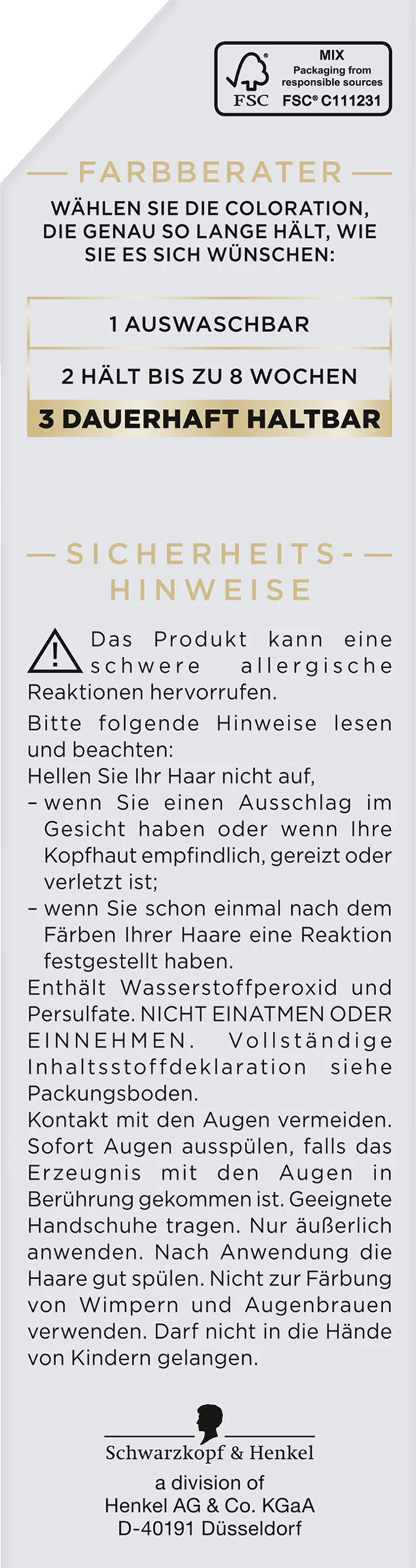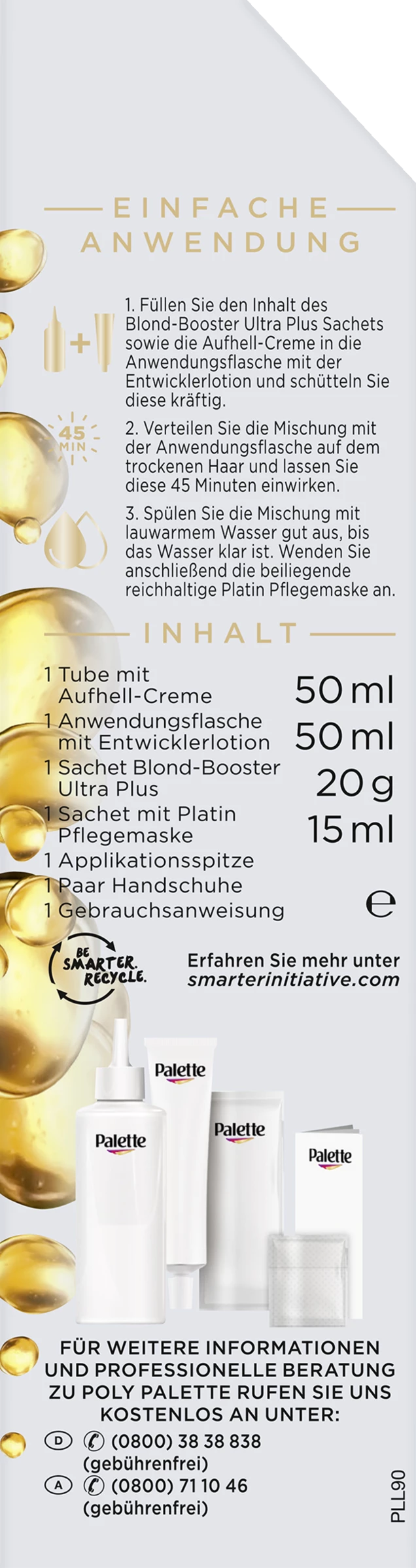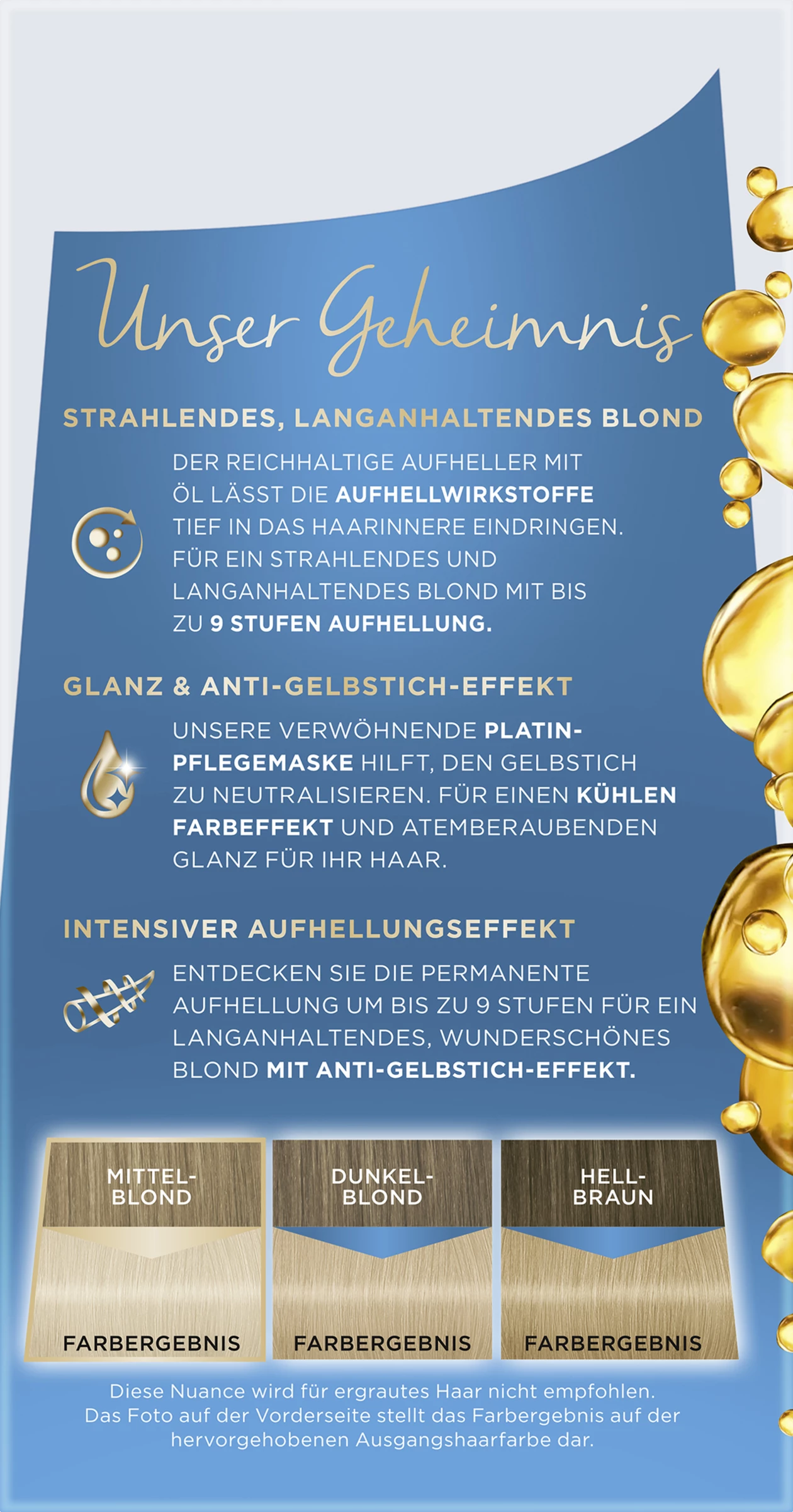 Das Produkt kann eine schwere allergische Reaktion hervorrufen. Bitte folgende Hinweise lesen und beachten: Hellen Sie Ihr Haar nicht auf, – wenn Sie einen Ausschlag im Gesicht haben oder wenn ihre Kopfhaut empfindlich, gereizt oder verletzt ist; – wenn Sie schon einmal nach dem Färben Ihrer Haare eine Reaktion festgestellt haben. Enthält Wasserstoffperoxid und Persulfate. Nicht einatmen oder einnehmen. Vollständige Inhaltsstoffdeklaration siehe Packungsboden. Kontakt mit den Augen vermeiden. Sofort Augen ausspülen, falls das Erzeugnis mit den Augen in Berührung gekommen ist. Geeignete Handschuhe tragen. Nur äußerlich anwenden. Nach Anwendung die Haare gut spülen. Nicht zur Färbung von Wimpern und Augenbrauen verwenden. Darf nicht in die Hände von Kindern gelangen.