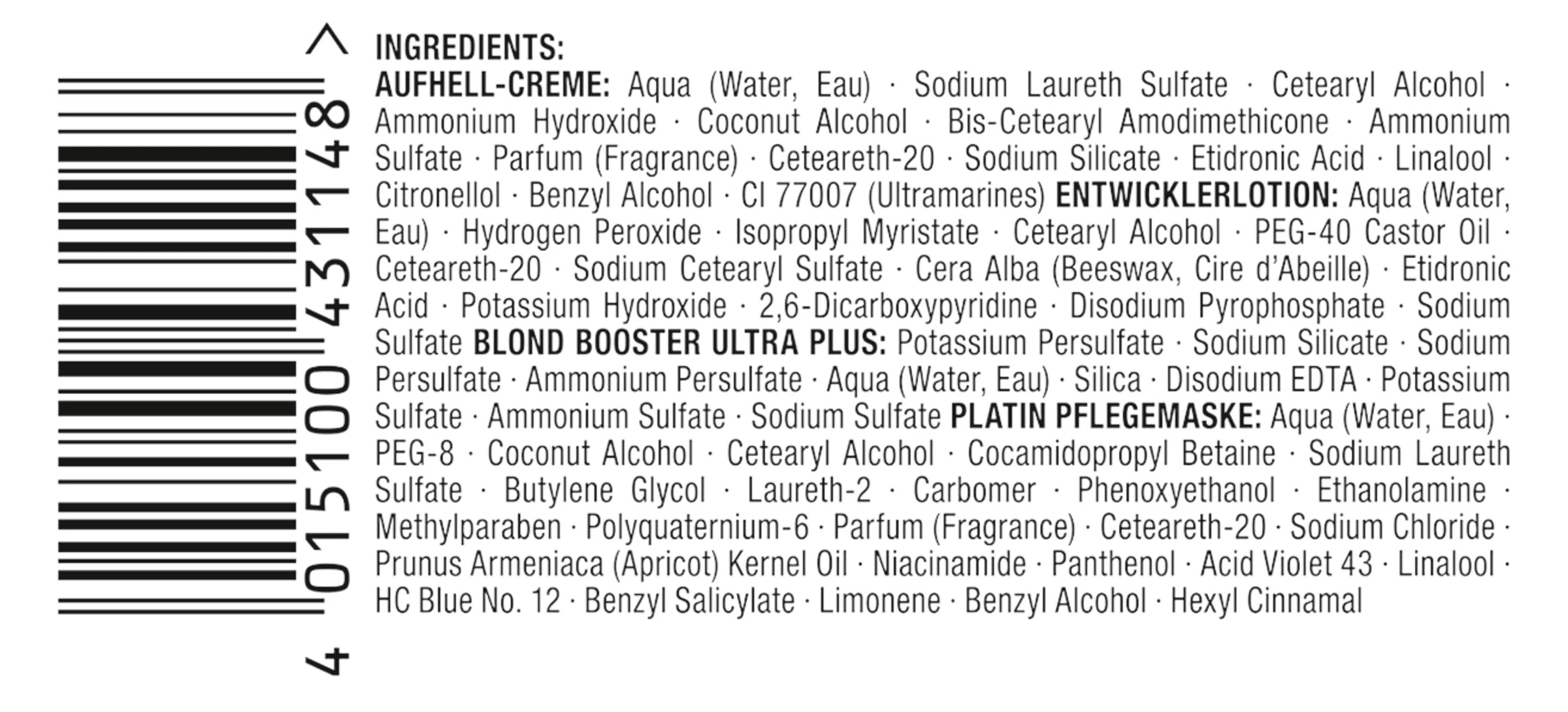 Platin Pflegemaske: Aqua (Water, Eau),PEG-8,Coconut Alcohol,Cetearyl Alcohol,Cocamidopropyl Betaine,Sodium Laureth Sulfate,Butylene Glycol,Laureth-2,Carbomer,Phenoxyethanol,Ethanolamine,Methylparaben,Polyquaternium-6,Parfum (Fragrance),Ceteareth-20,Sodium Chloride,Prunus Armeniaca (Apricot) Kernel Oil,Niacinamide,Panthenol,Acid Violet 43,Linalool,HC Blue No. 12,Benzyl Salicylate,Limonene,Benzyl Alcohol,Hexyl Cinnamal