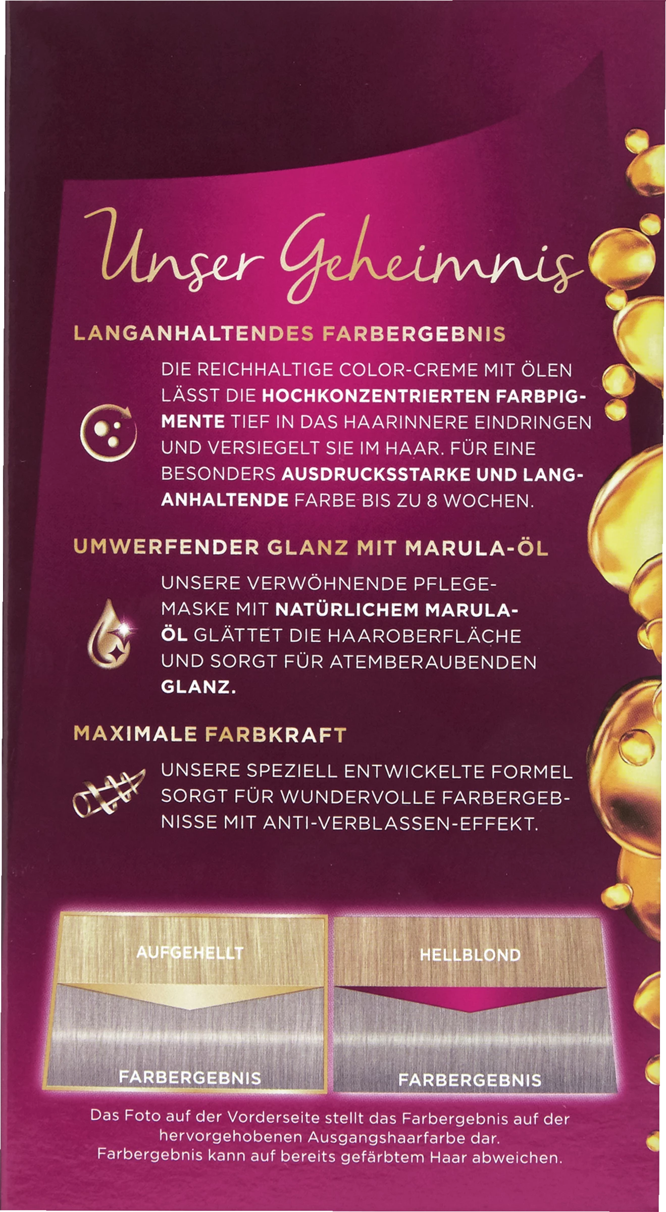 Die reichhaltige Color-Creme mit Ölen lässt die hochkonzentrierten Farbpigmente tief in das Haarinnere eindringen und versiegelt sie im Haar. Für eine besonders ausdrucksstarke und langanhaltende Farbe bis zu 8 Wochen. Unsere verwöhnende Pflegemaske mit natürlichem Marula-Öl glättet die Haaroberfläche uns sorgt für atemberaubenden Glanz. Unsere speziell entwickelte Formel sorgt für wundervolle Farbergebnisse – vom Ansatz bis in die Spitzen.