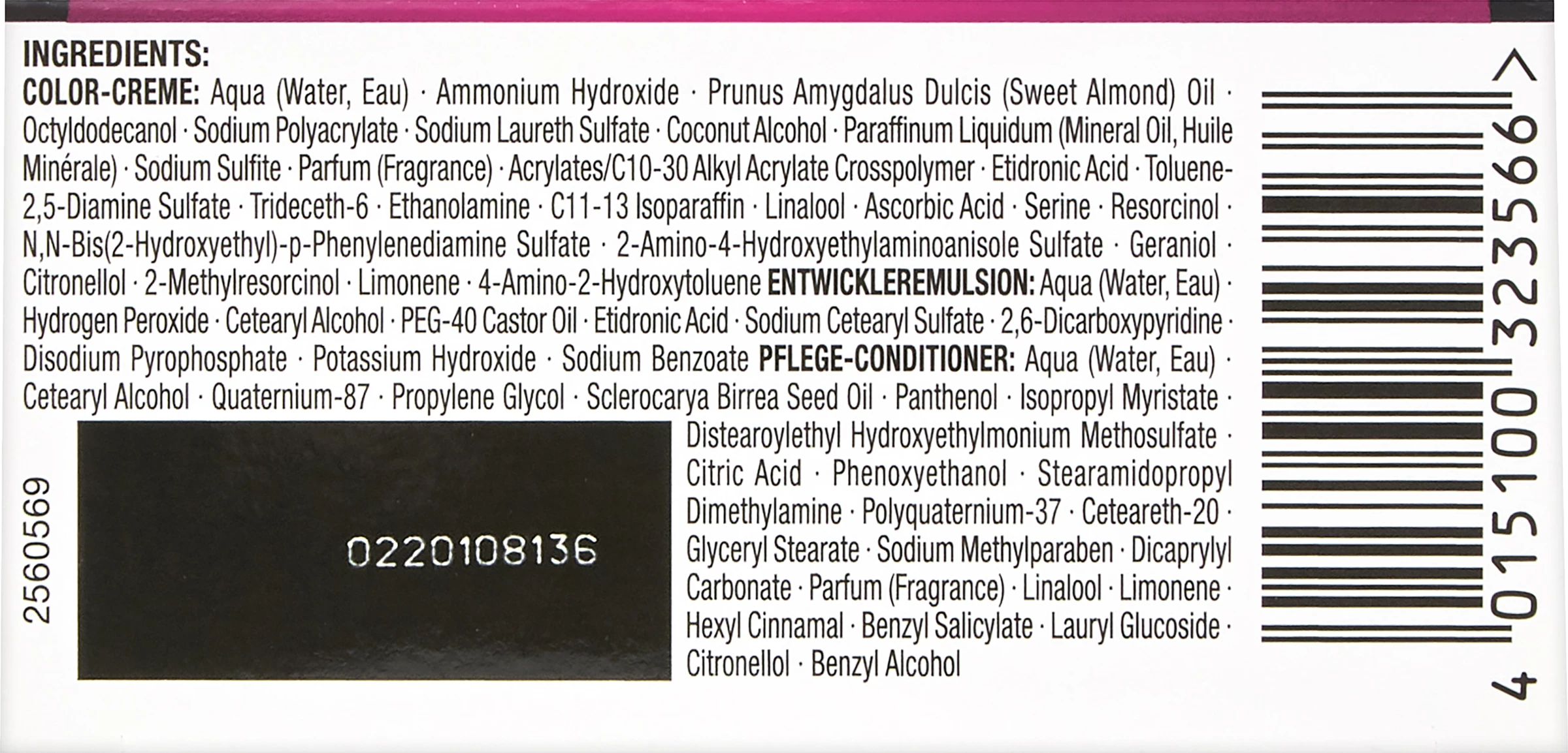 Haarfärbung/-tönung, oxidativ: Aqua, Ammonium Hydroxide, Prunus Amygdalus Dulcis Oil, Octyldodecanol, Sodium Polyacrylate, Sodium Laureth Sulfate, Coconut Alcohol, Paraffinum Liquidum, Sodium Sulfite, Acrylates/C10-30 Alkyl Acrylate Crosspolymer, Parfum, Etidronic Acid, Toluene-2,5-Diamine Sulfate, Trideceth-6, Ethanolamine, C11-13 Isoparaffin, Linalool, Ascorbic Acid, Serine, Resorcinol, N,N-bis (2-Hydroxyethyl)-p-Phenylenediamine Sulfate, 2-Amino-4-Hydroxyethylaminoanisole Sulfate, Geraniol, Citronellol, 2-Methylresorcinol, Limonene, 4-Amino-2-Hydroxytoluene | Pflegespülung, rinse off: Aqua, Cetearyl Alcohol, Quaternium-87, Propylene Glycol, Isopropyl Myristate, Distearoylethyl Hydroxyethylmonium Methosulfate, Citric Acid, Phenoxyethanol, Stearamidopropyl Dimethylamine, Polyquaternium-37, Ceteareth-20, Glyceryl Stearate, Sodium Methylparaben, Dicaprylyl Carbonate, Sclerocarya Birrea Seed Oil, Parfum, Linalool, Limonene, Hexyl Cinnamal, Benzyl Salicylate, Lauryl Glucoside, Citronellol, Panthenol, Benzyl Alcohol | Entwickler: Aqua, Hydrogen Peroxide, Cetearyl Alcohol, PEG-40 Castor Oil, Etidronic Acid, Sodium Cetearyl Sulfate, Disodium Pyrophosphate, 2,6-Dicarboxypyridine, Potassium Hydroxide, Sodium Benzoate.