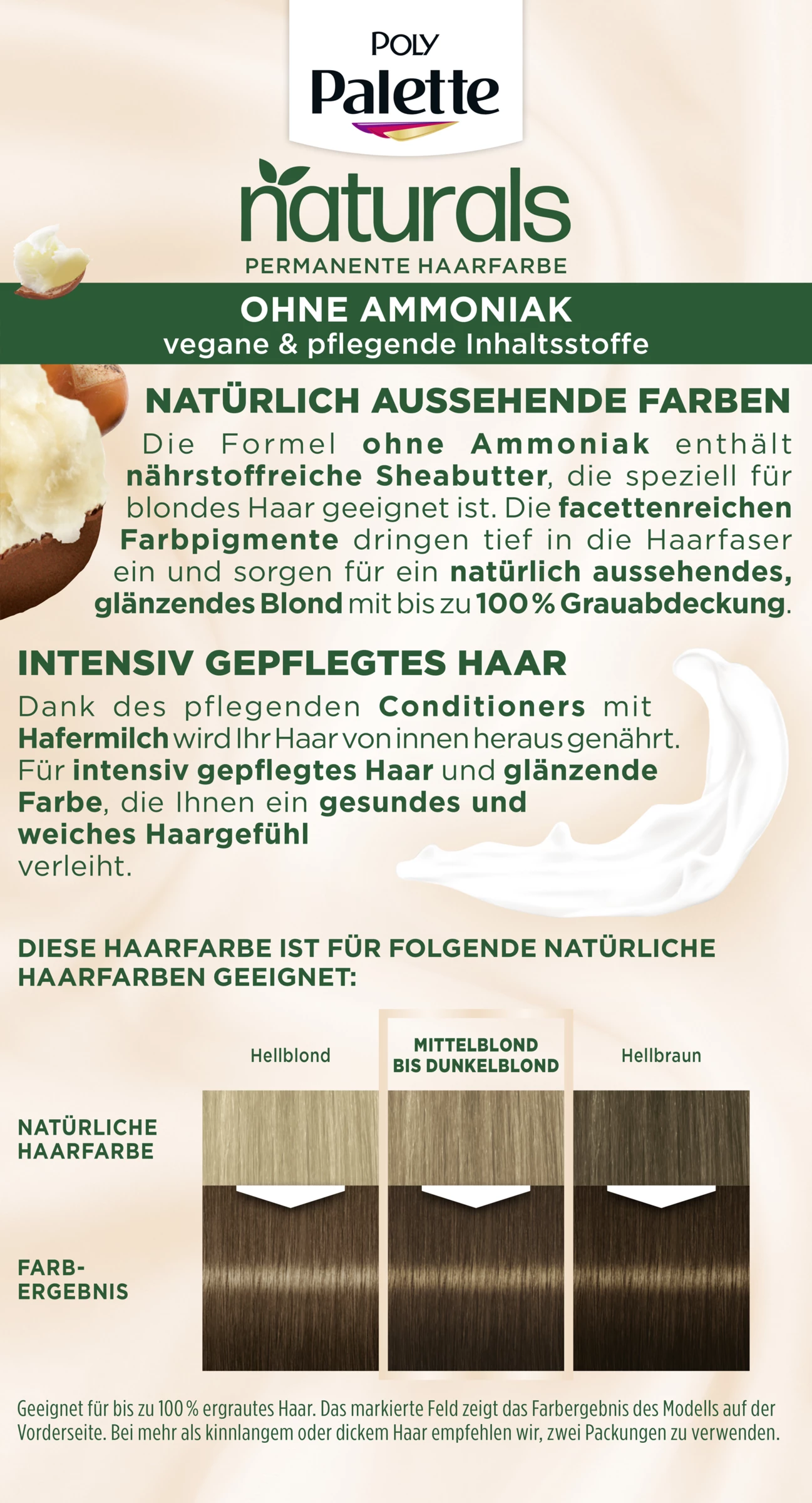 PALETTE – deine beste Wahl in Sachen Farbe! Natürlich aussehende & langanhaltende Farben für starkes & gepflegtes Haar. Die Formel ohne Ammoniak enthält nährstoffreiche Shea Butter, die speziell für blondes Haar geeignet ist. Die facettenreichen Farbpigmente dringen tief in die Haarfaser ein und sorgen für ein natürlich aussehendes, glänzendes Blond mit bis zu 100% Grauabdeckung. Intensiv gepflegtes Haar Dank des pflegenden Conditioners mit Hafermilch wird Ihr Haar von innen heraus genährt. Für intensiv gepflegtes Haar und glänzende Farbe, die Ihnen ein gesundes und weiches Haargefühl verleiht. Unser Versprechen Gemeinsam schaffen wir schöne Momente für eine bunte und nachhaltige Welt.