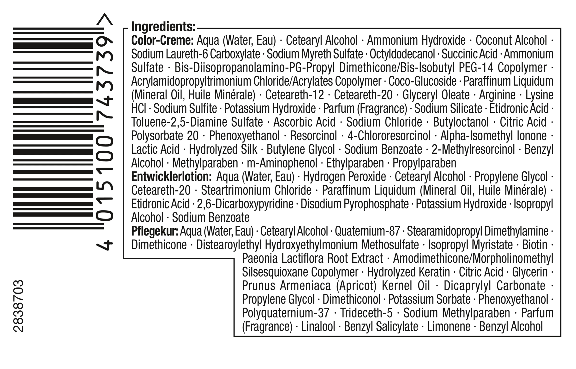 Ingredients: Color-Creme: Aqua (Water, Eau), Cetearyl Alcohol, Ammonium Hydroxide, Coconut Alcohol, Sodium Laureth-6 Carboxylate, Sodium Myreth Sulfate, Octyldodecanol, Succinic Acid, Ammonium Sulfate, Bis-Diisopropanolamino-PG-Propyl Dimethicone/Bis-Isobutyl PEG-14 Copolymer, Acrylamidopropyltrimonium Chloride/Acrylates Copolymer, Coco-Glucoside, Paraffinum Liquidum (Mineral Oil, Huile Minérale), Ceteareth-12, Ceteareth-20, Glyceryl Oleate, Arginine, Lysine HCl, Sodium Sulfite, Potassium Hydroxide, Parfum (Fragrance), Sodium Silicate, Etidronic Acid, Toluene-2,5-Diamine Sulfate, Ascorbic Acid, Sodium Chloride, Butyloctanol, Citric Acid, Polysorbate 20, Phenoxyethanol, Resorcinol, 4-Chlororesorcinol, Alpha-Isomethyl Ionone, Lactic Acid, Hydrolyzed Silk, Butylene Glycol, Sodium Benzoate, 2-Methylresorcinol, Benzyl Alcohol, Methylparaben, m-Aminophenol, Ethylparaben, Propylparaben Entwicklerlotion: Aqua (Water, Eau), Hydrogen Peroxide, Cetearyl Alcohol, Propylene Glycol, Ceteareth-20, Steartrimonium Chloride, Paraffinum Liquidum (Mineral Oil, Huile Minérale), Etidronic Acid, 2,6-Dicarboxypyridine, Disodium Pyrophosphate, Potassium Hydroxide, Isopropyl Alcohol, Sodium Benzoate Pflegekur: Aqua (Water, Eau), Cetearyl Alcohol, Quaternium-87, Stearamidopropyl Dimethylamine, Dimethicone, Distearoylethyl Hydroxyethylmonium Methosulfate, Isopropyl Myristate, Biotin, Paeonia Lactiflora Root Extract, Amodimethicone/Morpholinomethyl Silsesquioxane Copolymer, Hydrolyzed Keratin, Citric Acid, Glycerin, Prunus Armeniaca (Apricot) Kernel Oil, Dicaprylyl Carbonate, Propylene Glycol, Dimethiconol, Potassium Sorbate, Phenoxyethanol, Polyquaternium-37, Trideceth-5, Sodium Methylparaben, Parfum (Fragrance), Linalool, Benzyl Salicylate, Limonene, Benzyl Alcohol