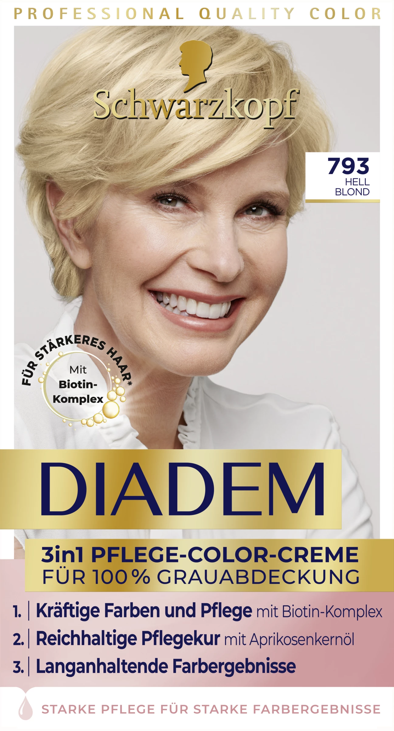 SCHWARZKOPF DIADEM 3 in 1 Pflege-Color-Creme 793 Hell Blond – Für satte, langanhaltende Farbergebnisse. Mit Aprikosenkernöl & Biotin-Komplex. Für Haare, die sich nach der Anwendung gesund anfühlen und gesund aussehen, für 100% Grauabdeckung.