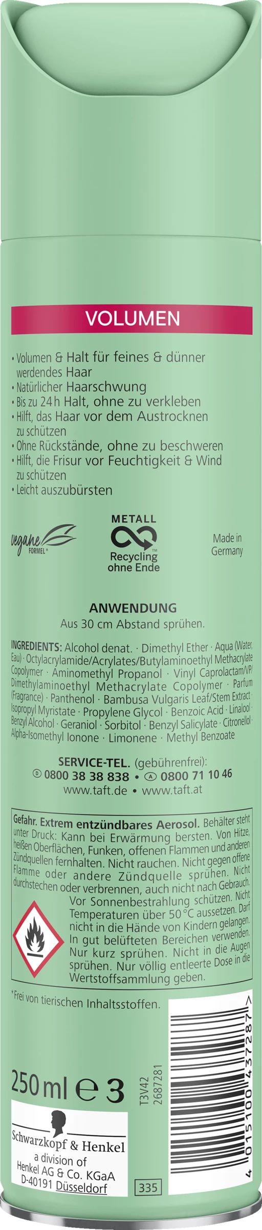 Das Taft Volumen Haarspray für dünner werdendes Haar gibt Volumen und Halt und verbessert gleichzeitig den natürlichen Haarschwung. Für bis zu 24 Stunden langanhaltenden Halt, ohne zu verkleben oder Rückstände zu hinterlassen, gleichzeitig lässt es sich leicht ausbürsten. Dieses Haarspray hilft, Ihr Haar vor dem Austrocknen zu schützen, ohne es zu beschweren. Es verleiht Ihrem Haar Volumen und Halt und hilft, es vor Feuchtigkeit und Wind zu schützen. Taft Haarsprays verwenden vegane Formeln und sind frei von tierischen Inhaltsstoffen.