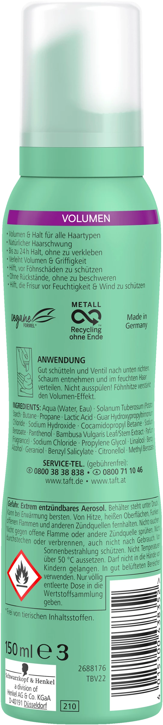 Der Taft Volumen Schaumfestiger eignet sich für alle Haartypen und verleiht Ihrem Haar Volumen, Griffigkeit und Halt, während der natürliche Haarschwung verbessert wird. Für bis zu 24 Stunden langanhaltenden Halt, ohne zu verkleben, Rückstände zu hinterlassen oder das Haar zu beschweren. Ihr Haar wird sowohl vor Föhnschäden als auch vor Feuchtigkeit und Wind geschützt. Taft Schaumfestiger verwenden vegane Formeln und sind frei von tierischen Inhaltsstoffen.