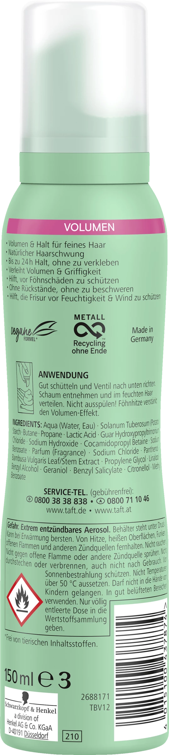 Der Taft Volumen Schaumfestiger für feines Haar verleiht Ihrem Haar Volumen, Griffigkeit und Halt, während der natürliche Haarschwung verbessert wird. Für bis zu 24 Stunden langanhaltenden Halt, ohne zu verkleben, Rückstände zu hinterlassen oder das Haar zu beschweren. Ihr Haar wird sowohl vor Föhnschäden als auch vor Feuchtigkeit und Wind geschützt. Taft Schaumfestiger verwenden vegane Formeln und sind frei von tierischen Inhaltsstoffen.