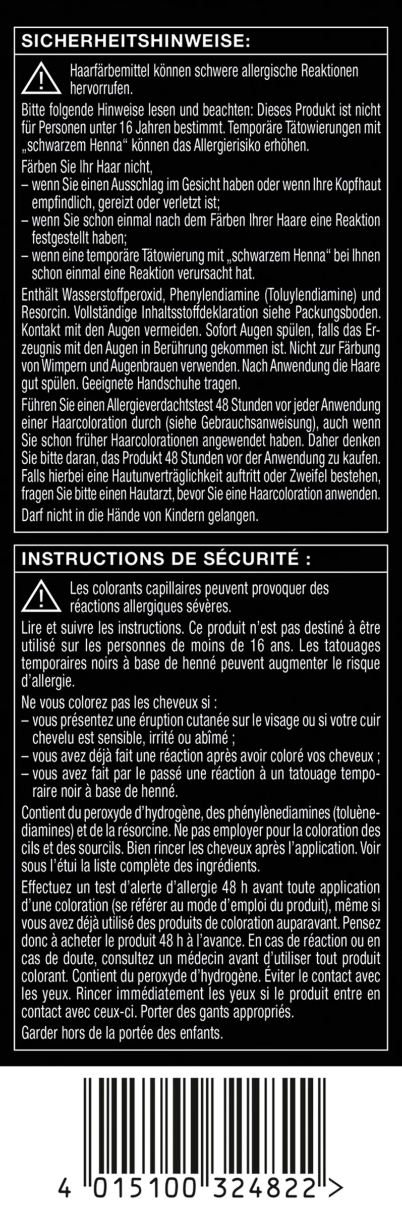 Wir empfehlen diese Nuance fĂĽr mittelbraunes bis schwarzbraunes Haar. FĂĽr leicht bis mittel stark ergrautes Haar geeignet. Dauerhaft haltbar. Detaillierte Anwendungshinweise in der Packungsbeilage beachten.