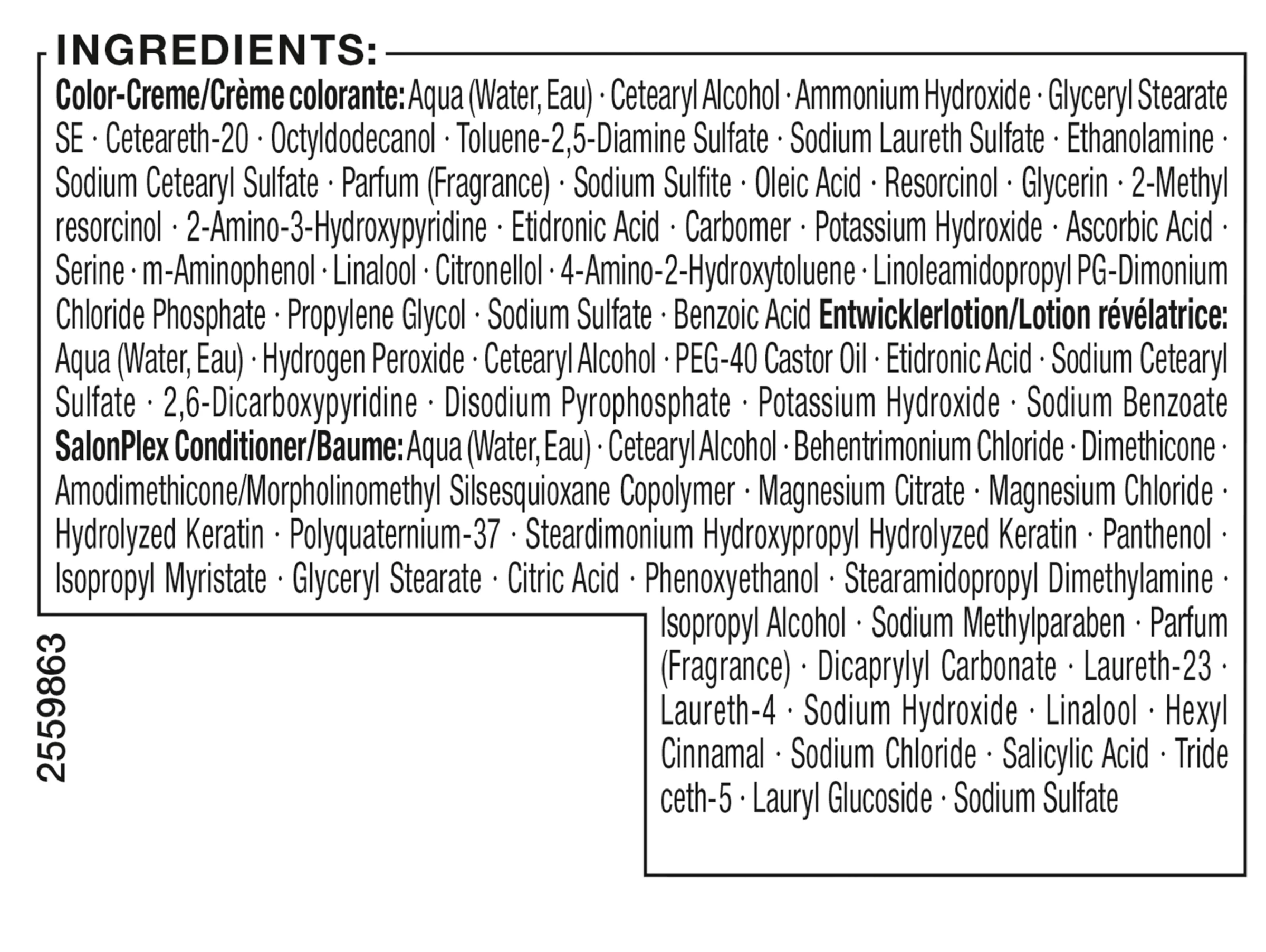 Color-Creme/Creme colorante:Aqua (Water, Eau) . Cetearyl Alcohol, Ammonium Hydroxide . Glyceryl Stearate SE, Ceteareth-20 . Octyldodecanol . Toluene-2,5-Diamine Sulfate, Sodium Laureth Sulfate, Ethanolamine Sodium Cetearyl Sulfate, Pal-1(.1m (Fragrance) . Sodium Sulfite, Oleic Acid, Resorcinol . Glycerin . 2-Vethyl resorcinol, 2-Amino-3-Hydroxypyridine, Etidronic Acid . Carbomer . Potassium Hydroxide . Ascorbic Acid Serine . m-Aminophenol . Linalool . Citronellol . 4-Amino-2-Hydroxytoluene . Linoleamidopropyl PG-Dimonium Chloride Phosphate, Propylene Glycol, Sodium Sulfate, Benzoic Acid