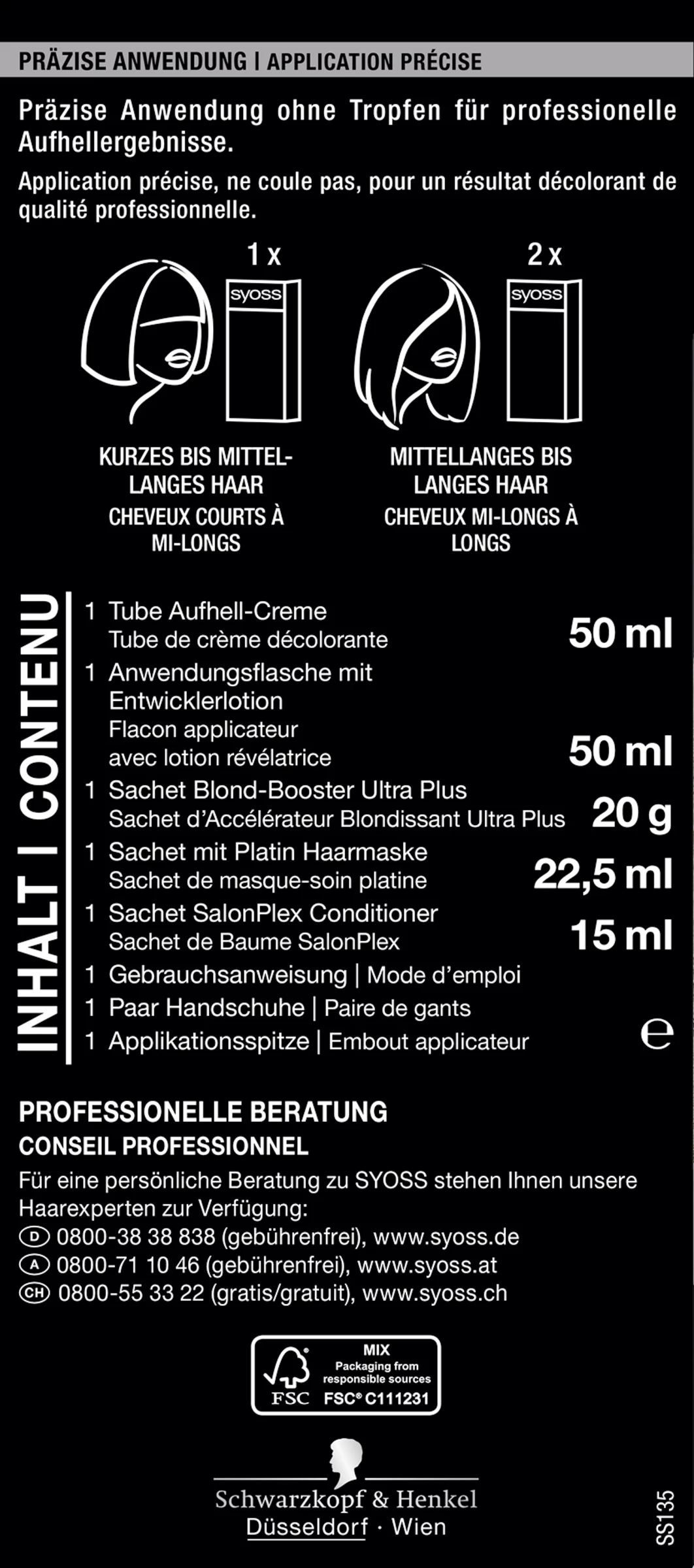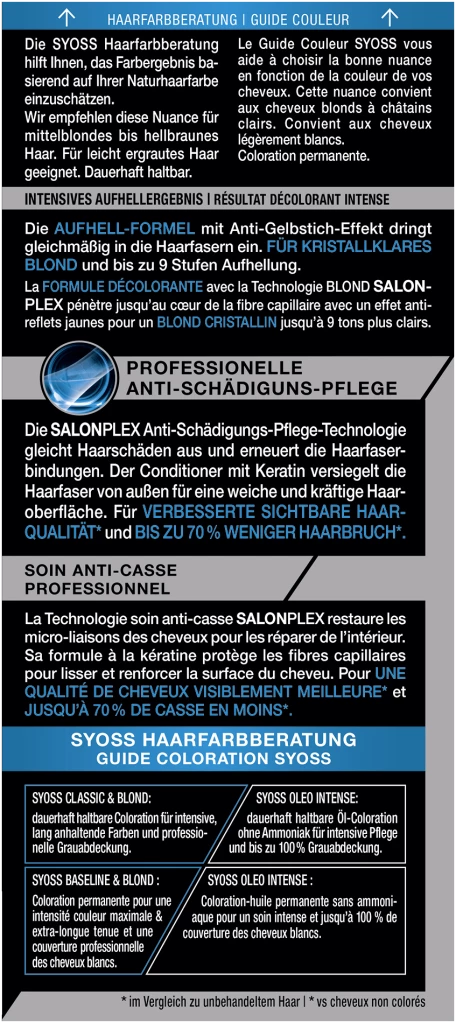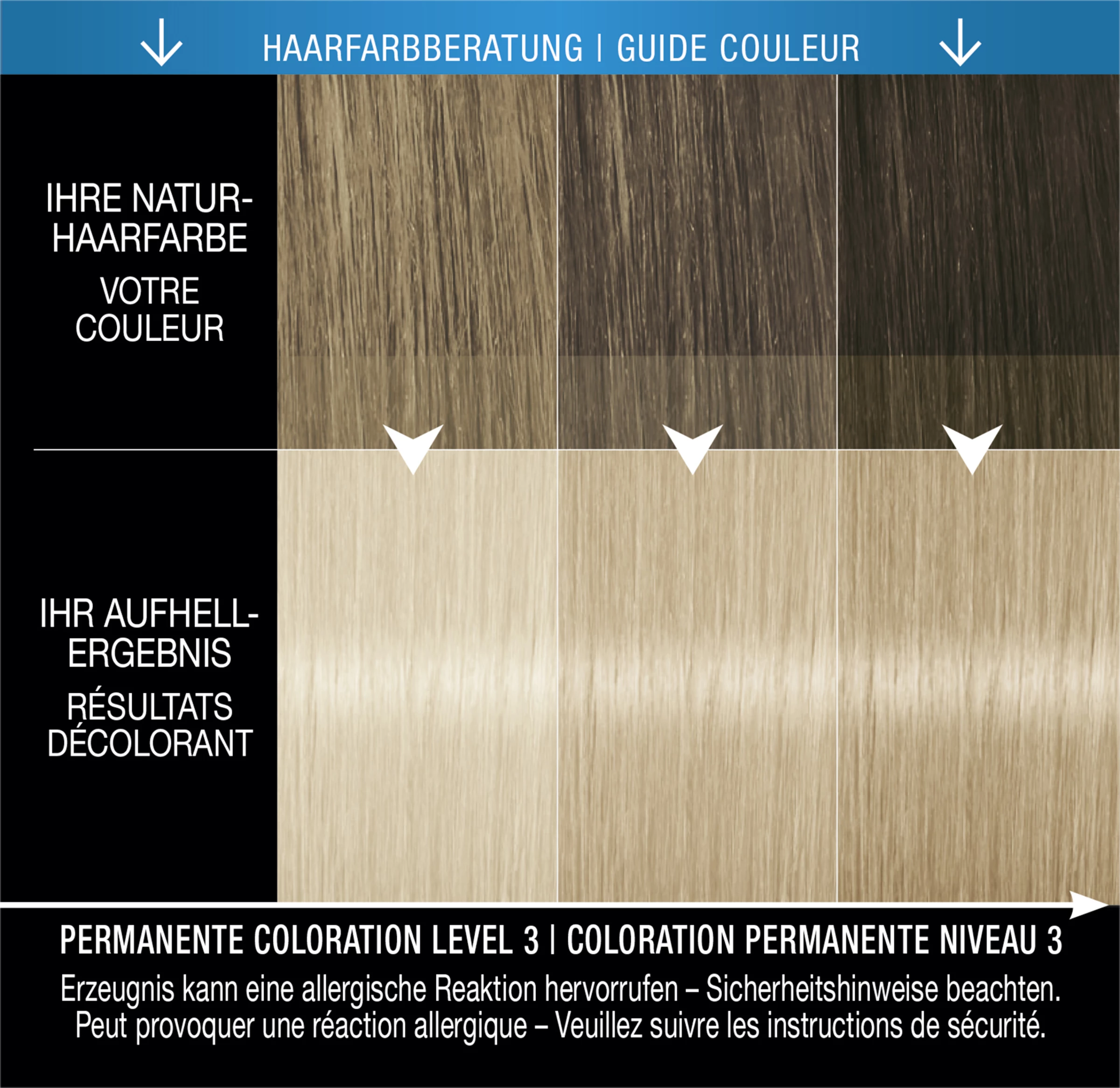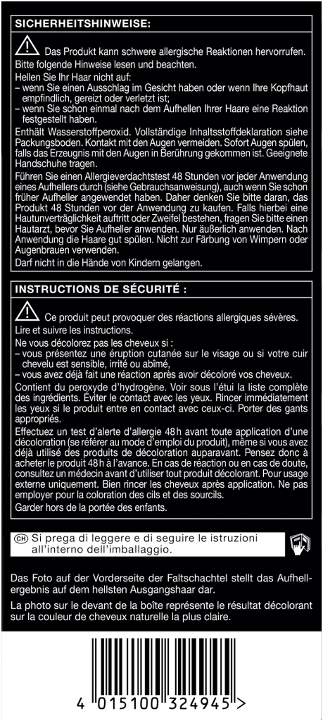 Das Produkt kann schwere allergische Reaktionen hervorrufen. Bitte folgende Hinweise lesen und beachten. Hellen Sie Ihr Haar nicht auf, wenn: – Sie einen Ausschlag im Gesicht haben oder wenn Ihre Kopfhaut empfindlich, gereizt oder verletzt ist, – Sie schon einmal nach dem Aufhellen Ihrer Haare eine Reaktion festgestellt haben. Nach Anwendung die Haare gut spülen. Vollständige Inhaltsstoffdeklaration siehe Packungsboden. Enthält Wasserstoffperoxid und Ammoniak. Kontakt mit den Augen vermeiden. Sofort Augen spülen, falls das Erzeugnis mit den Augen in Berührung gekommen ist. Geeignete Handschuhe tragen. Führen Sie einen Allergieverdachtstest 48 Stunden vor jeder Aufhellung durch (siehe Gebrauchsanweisung), auch wenn Sie schon früher Aufheller angewendet haben. Daher denken Sie bitte daran, das Produkt 48 Stunden vor der Anwendung zu kaufen. Falls hierbei eine Hautunverträglichkeit auftritt oder Zweifel bestehen, fragen Sie bitte einen Hautarzt, bevor Sie einen Aufheller anwenden. Nur äußerlich anwenden. Nicht zur Färbung von Wimpern und Augenbrauen verwenden.