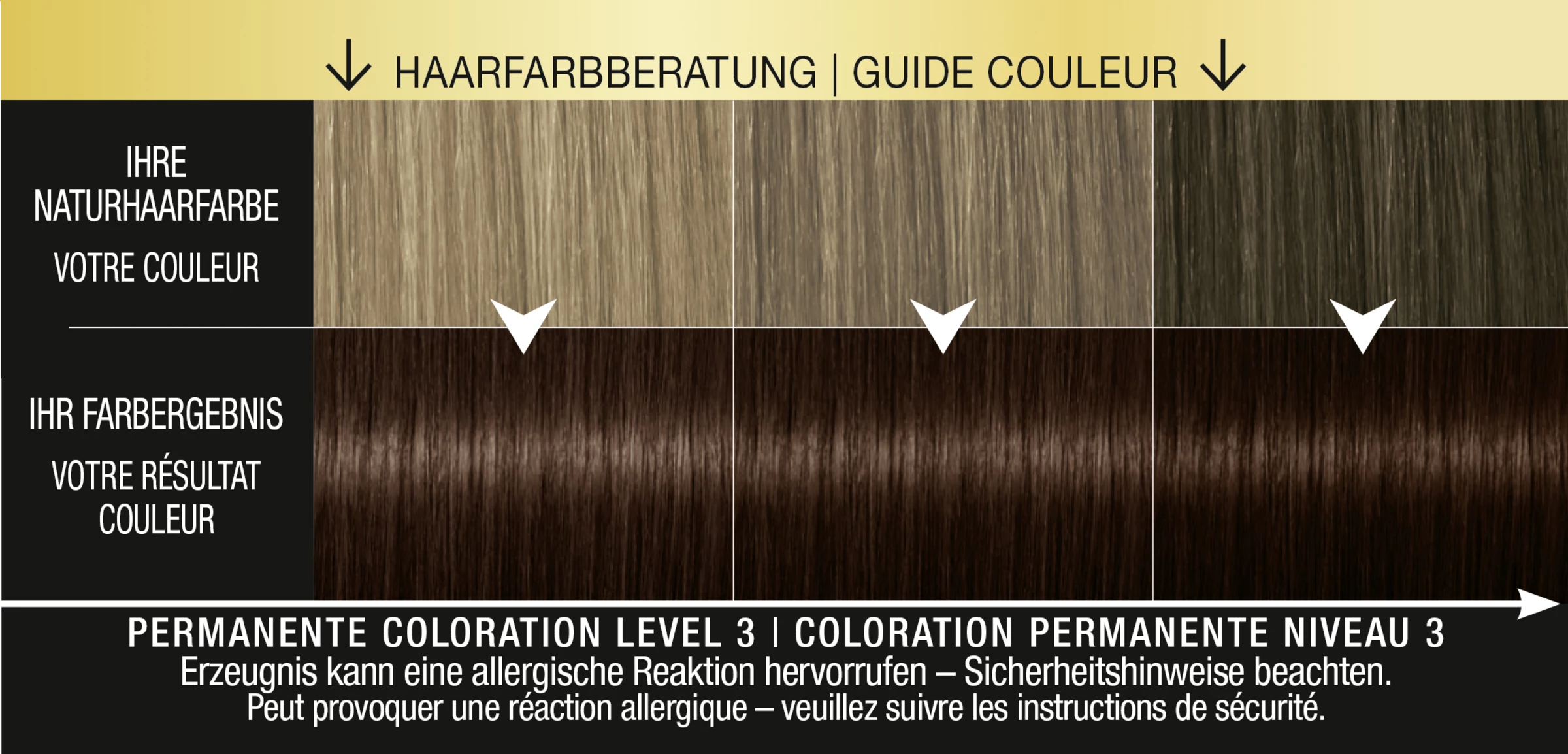 Haarfärbemittel können schwere allergische Reaktionen hervorrufen. Bitte folgende Hinweise lesen und beachten: Dieses Produkt ist nicht für Personen unter 16 Jahren bestimmt. Temporäre Tätowierungen mit „schwarzem Henna“ können das Allergierisiko erhöhen. Färben Sie Ihr Haar nicht, – wenn Sie einen Ausschlag im Gesicht haben oder wenn Ihre Kopfhaut empfindlich, gereizt oder verletzt ist; – wenn Sie schon einmal nach dem Färben Ihrer Haare eine Reaktion festgestellt haben; – wenn eine temporäre Tätowierung mit „schwarzem Henna“ bei Ihnen schon einmal eine Reaktion verursacht hat. Enthält Wasserstoffperoxid. Vollständige Inhaltsstoffdeklaration siehe Packungsboden. Kontakt mit den Augen vermeiden. Sofort Augen spülen, falls das Erzeugnis mit den Augen in Berührung gekommen ist. Nicht zur Färbung von Wimpern und Augenbrauen verwenden. Nach Anwendung die Haare gut spülen. Geeignete Handschuhe tragen. Führen Sie einen Allergieverdachtstest 48 Stunden vor jeder Anwendung einer Haarcoloration durch (siehe Gebrauchsanweisung), auch wenn Sie schon früher Haarcolorationen angewendet haben. Daher denken Sie bitte daran, das Produkt 48 Stunden vor der Anwendung zu kaufen. Falls hierbei eine Haut-unverträglichkeit auftritt oder Zweifel bestehen, fragen Sie bitte einen Hautarzt, bevor Sie eine Haarcoloration anwenden.