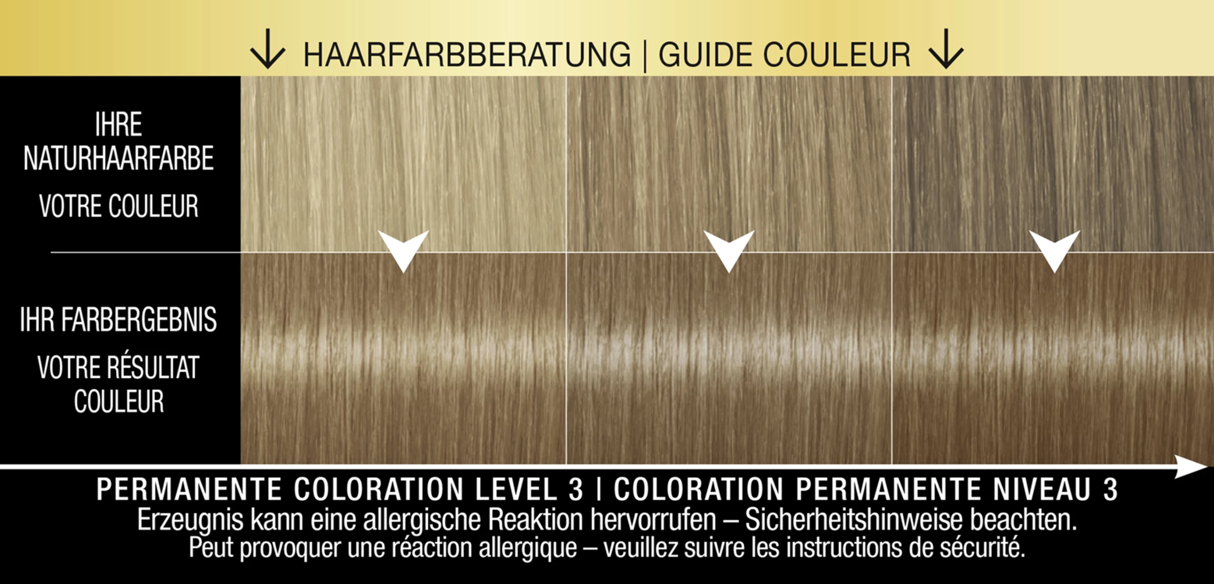 Haarfärbemittel können schwere allergische Reaktionen hervorrufen. Bitte folgende Hinweise lesen und beachten: Dieses Produkt ist nicht für Personen unter 16 Jahren bestimmt. Temporäre Tätowierungen mit „schwarzem Henna“ können das Allergierisiko erhöhen. Färben Sie Ihr Haar nicht, – wenn Sie einen Ausschlag im Gesicht haben oder wenn Ihre Kopfhaut empfindlich, gereizt oder verletzt ist; – wenn Sie schon einmal nach dem Färben Ihrer Haare eine Reaktion festgestellt haben; – wenn eine temporäre Tätowierung mit „schwarzem Henna“ bei Ihnen schon einmal eine Reaktion verursacht hat. Enthält Wasserstoffperoxid. Vollständige Inhaltsstoffdeklaration siehe Packungsboden. Kontakt mit den Augen vermeiden. Sofort Augen spülen, falls das Erzeugnis mit den Augen in Berührung gekommen ist. Nicht zur Färbung von Wimpern und Augenbrauen verwenden. Nach Anwendung die Haare gut spülen. Geeignete Handschuhe tragen. Führen Sie einen Allergieverdachtstest 48 Stunden vor jeder Anwendung einer Haarcoloration durch (siehe Gebrauchsanweisung), auch wenn Sie schon früher Haarcolorationen angewendet haben. Daher denken Sie bitte daran, das Produkt 48 Stunden vor der Anwendung zu kaufen. Falls hierbei eine Haut-unverträglichkeit auftritt oder Zweifel bestehen, fragen Sie bitte einen Hautarzt, bevor Sie eine Haarcoloration anwenden.
