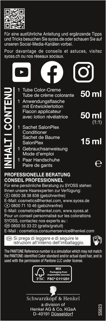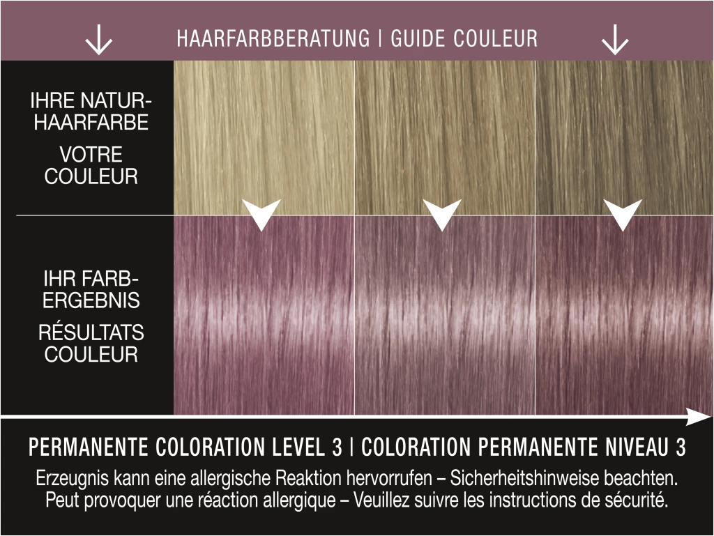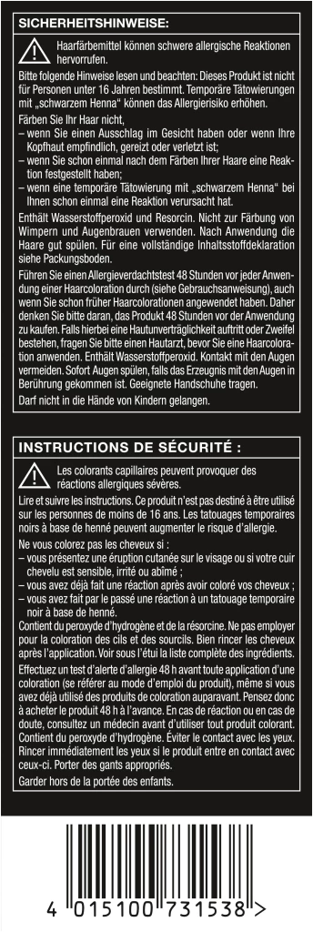Haarfärbemittel können schwere allergische Reaktionen hervorrufen. Bitte folgende Hinweise lesen und beachten: Dieses Produkt ist nicht für Personen unter 16 Jahren bestimmt. Temporäre Tätowierungen mit „schwarzem Henna“ können das Allergierisiko erhöhen. Färben Sie Ihr Haar nicht, – wenn Sie einen Ausschlag im Gesicht haben oder wenn Ihre Kopfhaut empfindlich, gereizt oder verletzt ist; – wenn Sie schon einmal nach dem Färben Ihrer Haare eine Reaktion festgestellt haben; – wenn eine temporäre Tätowierung mit „schwarzem Henna“ bei Ihnen schon einmal eine Reaktion verursacht hat. Enthält Wasserstoffperoxid. Nicht zur Färbung von Wimpern und Augenbrauen verwenden. Nach Anwendung die Haare gut spülen. Für eine vollständige Inhaltsstoffdeklaration siehe Packungsboden. Führen Sie einen Allergieverdachtstest 48 Stunden vor jeder Anwendung einer Haarcoloration durch (siehe Gebrauchsanweisung), auch wenn Sie schon früher Haarcolorationen angewendet haben. Daher denken Sie bitte daran, das Produkt 48 Stunden vor der Anwendung zu kaufen. Falls hierbei eine Hautunverträglichkeit auftritt oder Zweifel bestehen, fragen Sie bitte einen Hautarzt, bevor Sie eine Haarcoloration anwenden. Enthält Wasserstoffperoxid. Kontakt mit den Augen vermeiden. Sofort Augen spülen, falls das Erzeugnis mit den Augen in Berührung gekommen ist. Geeignete Handschuhe tragen. Darf nicht in die Hände von Kindern gelangen.