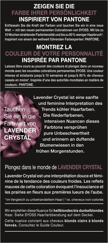 Zeigen Sie die Farbe Ihrer Persönlichkeit – inspiriert von Pantone. Entfesseln Sie die Kraft der Farben und tauchen Sie ein in eine neue Welt — mit den neuen permanenten Colorationen von Syoss. Inspiriert von einem der weltweit führenden Farbexperten: Pantone. Erleben Sie 10 Wochen strahlende Farbintensität und professionelle Grauabdeckung. Profitieren Sie dank des Anti-Schädigungs-Systems von Syoss, das die SalonPlex-Technologie mit Keratin kombiniert, von 80 % weniger Haarbruch*.