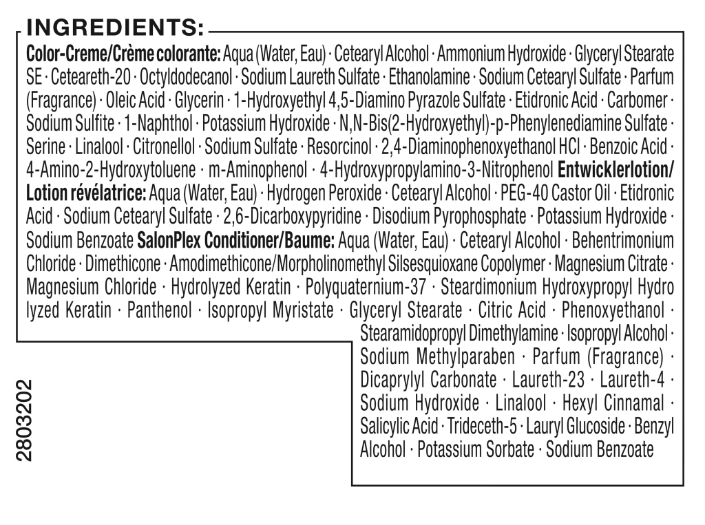 Color-Creme: Aqua (Water, Eau)*Cetearyl Alcohol*Ammonium Hydroxide*Glyceryl Stearate SE*Ceteareth-20*Octyldodecanol*Sodium Laureth Sulfate*Ethanolamine*Sodium Cetearyl Sulfate*Parfum (Fragrance)*Oleic Acid*Glycerin*1-Hydroxyethyl 4,5-Diamino Pyrazole Sulfate*Etidronic Acid*Carbomer*Sodium Sulfite*1-Naphthol*Potassium Hydroxide*N,N-Bis(2-Hydroxyethyl)-p-Phenylenediamine Sulfate*Serine*Linalool*Citronellol*Sodium Sulfate*Resorcinol*2,4-Diaminophenoxyethanol HCl*Benzoic Acid*4-Amino-2-Hydroxytoluene*m-Aminophenol*4-Hydroxypropylamino-3-Nitrophenol