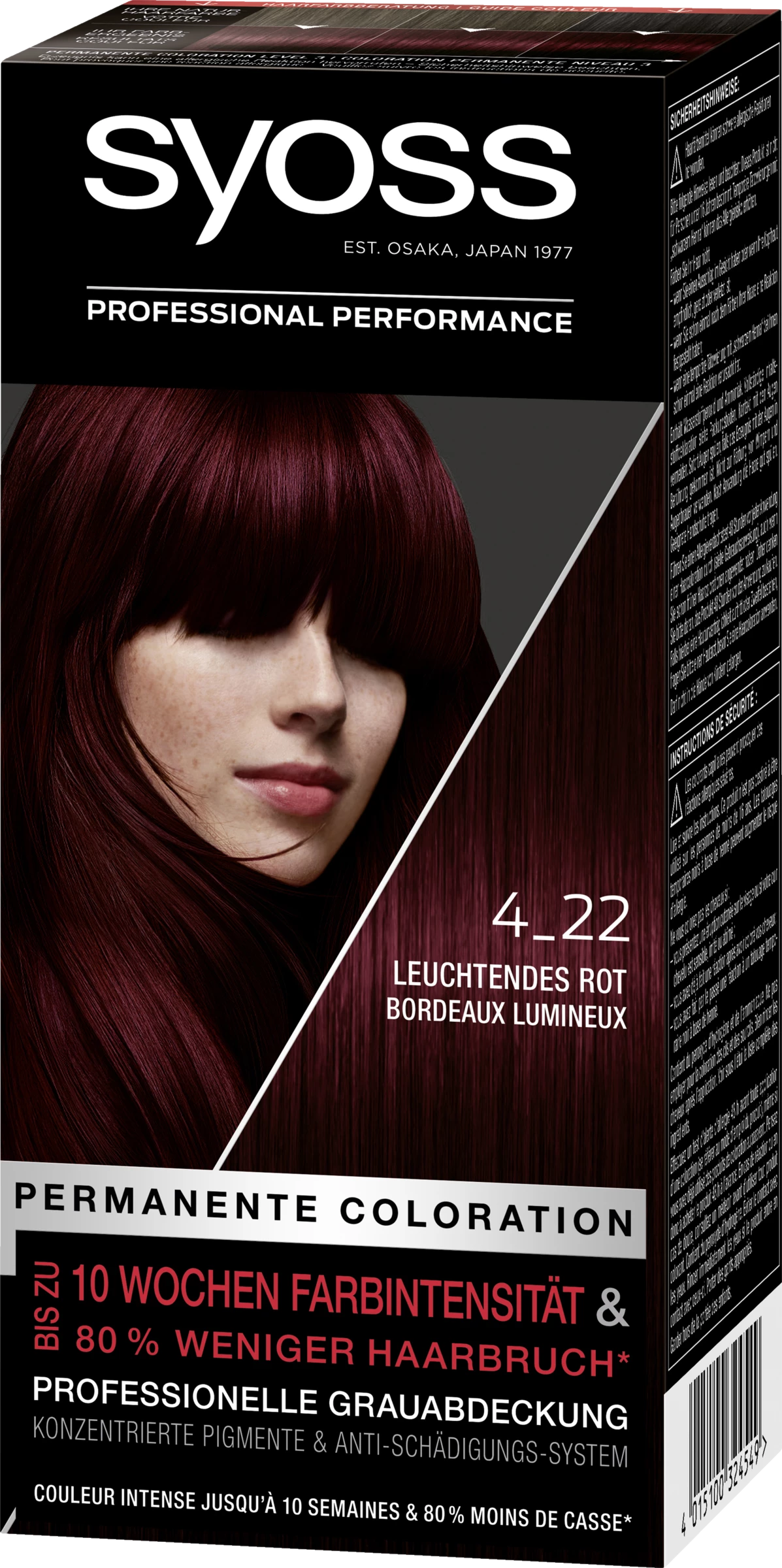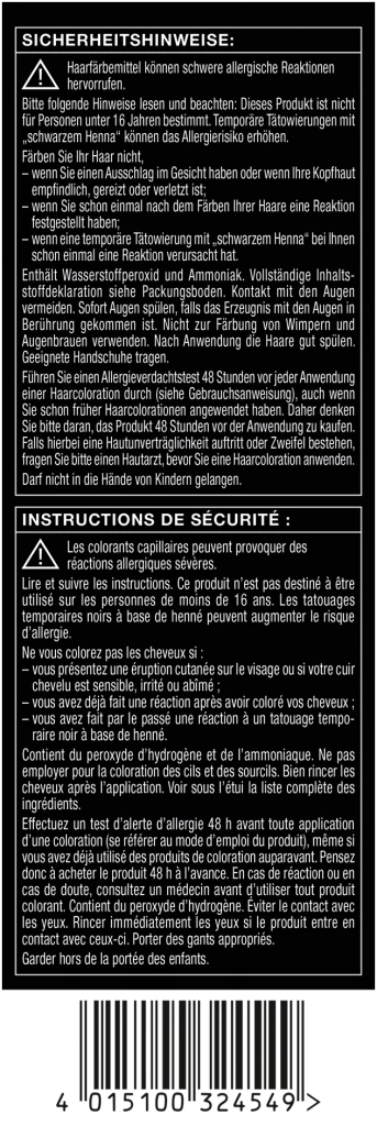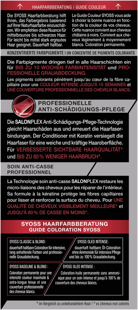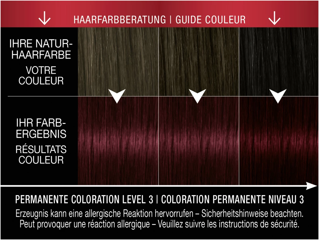 | Variationen | 4-2 Mahagoni, 4-1 Mittelbraun, 8-7 – Honigblond, 6-8 Dunkelblond, 1-1 Schwarz, 5-8 Haselnuss, 4-8 Schokobraun, 1-4 Blauschwarz, 5-29 Intensives Rot, 3-1 Dunkelbraun |